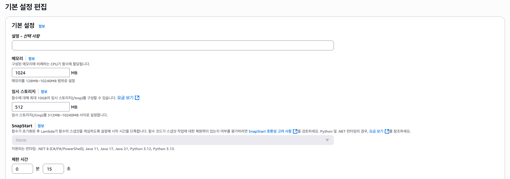 함수가 생성되었다면 설정에서 메모리와 제한 시간을 좀 늘려주자.