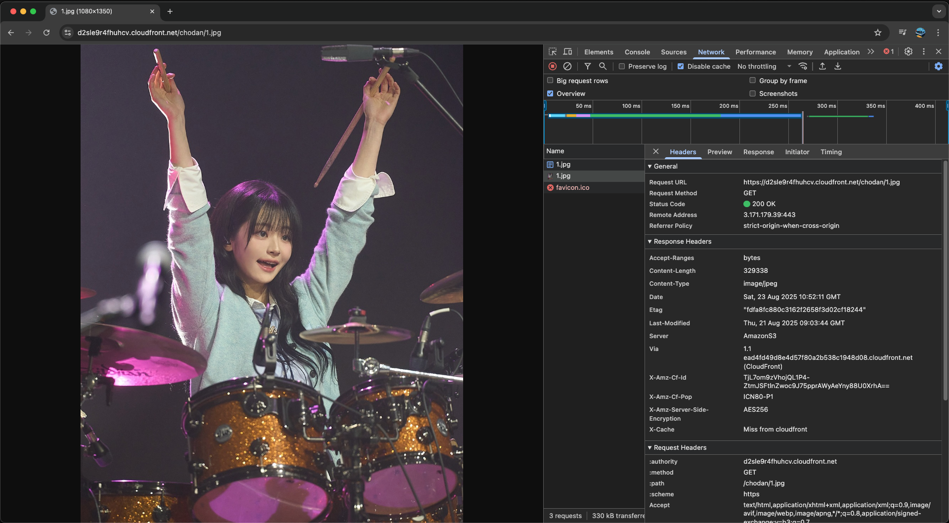 그럼 이제 CloudFront를 통해 S3 버킷에 접근할 수 있다. 테스트로 이미지를 가져와보자.