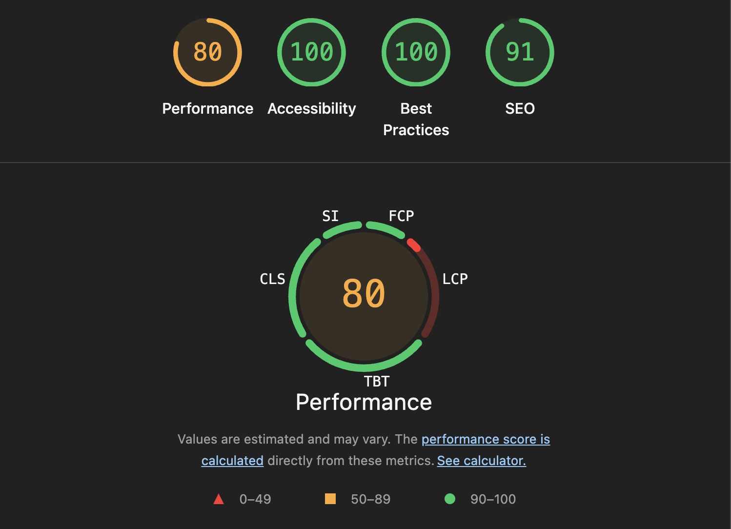 크롬 DevTools LightHouse에서 테스트해보면 데스크탑 환경에서 LCP(Largest Contentful Paint)가 높은 것을 볼 수 있다.