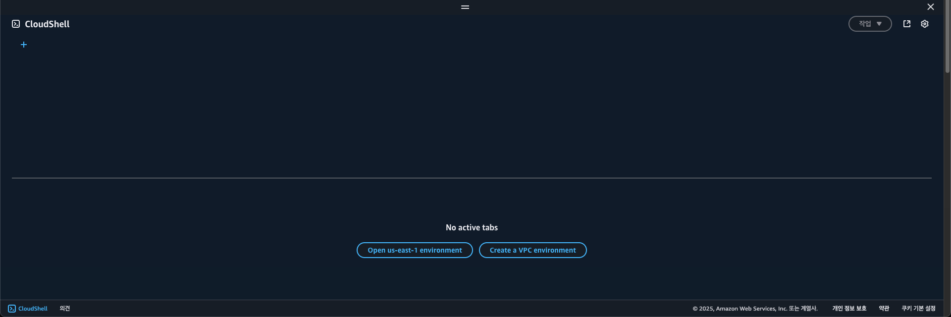 예전엔 Cloud9을 통해 온라인으로 코드를 수정하고 터미널을 열어 빌드할 수 있었으나, 서비스가 종료되어 그 대신 CloudShell을 이용하기로 하였다. 기본적인 AWS CLI, NodeJS 등은 설치되어 있으니 문제 없다.