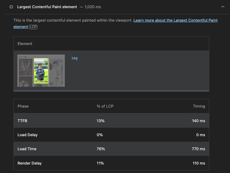 LightHouse 또한 처참했던 LCP가 매우 정상 범위로 들어섰으며, 자세히 확인해봐도 전혀 문제가 없다.