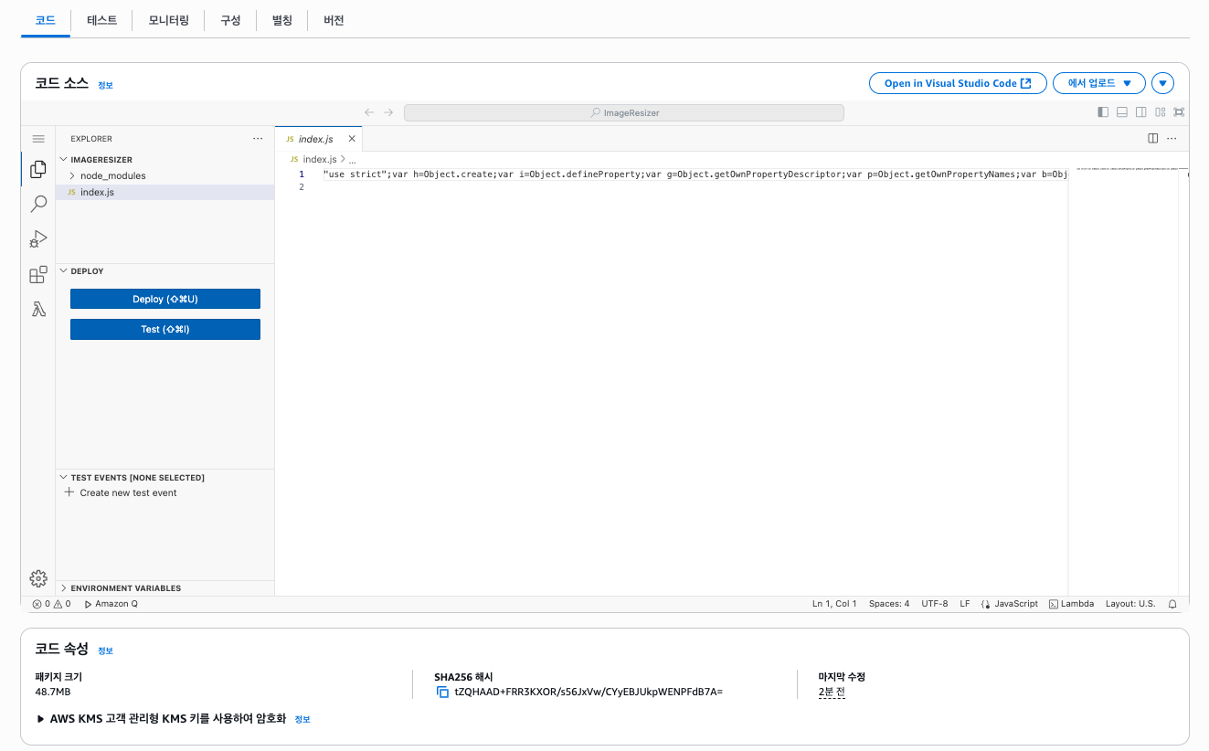 그리고 이제 소스코드를 람다 함수에 배포해야 하는데, 아까 말했듯이 sharp 라이브러리가 네이티브 라이브러리를 포함하고 있어 Amazon Linux 2 환경에서 빌드해야 한다.