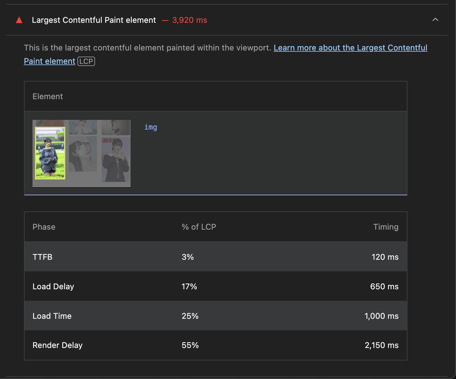 일반적으로 LCP는 2.5초 미만이여야 "좋음"으로 본다. 그런데 데이터를 가져오고 랜더링하기 까지 약 4초가 걸려서 저러한 처참한 결과가 나타난 것이다. (이미지 사이즈가 커서 랜더링 또한 오래 걸린다.)