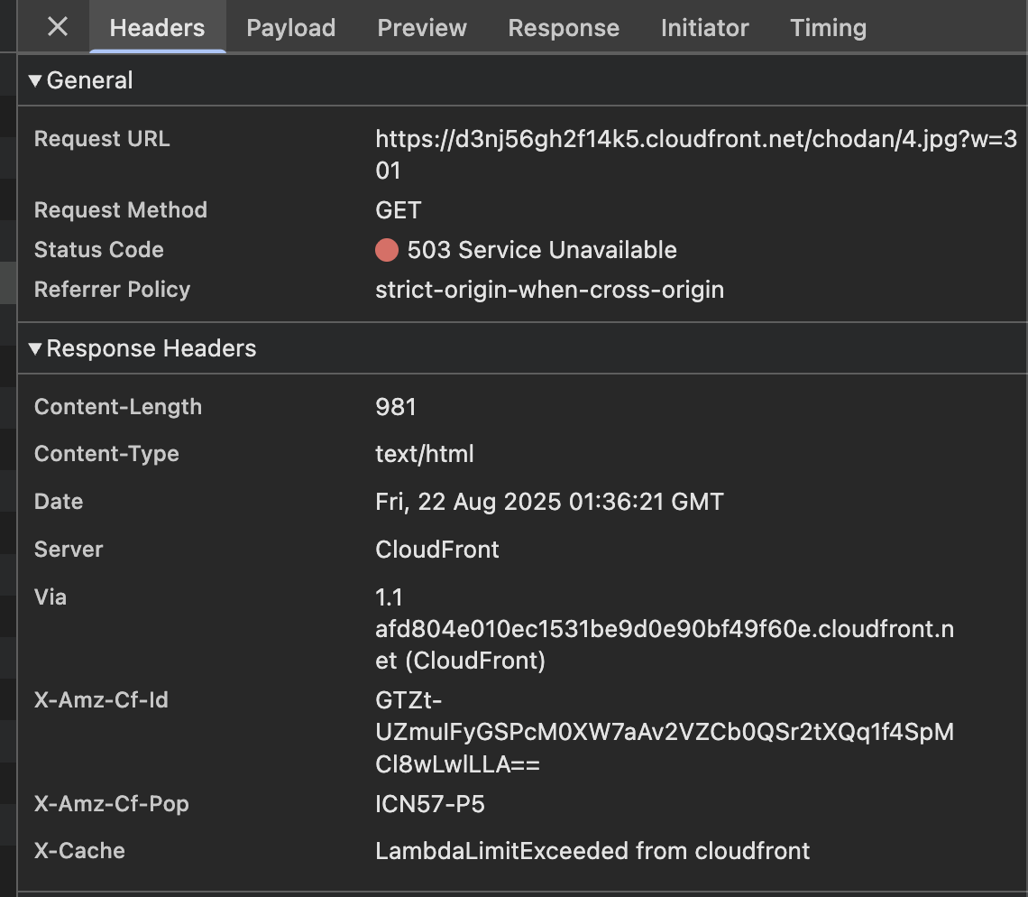 사진과 같이 Lambda Limit Exceeded from Cloudfront라는 메세지와 함께 503 Service Unavailable 에러가 발생하였다.