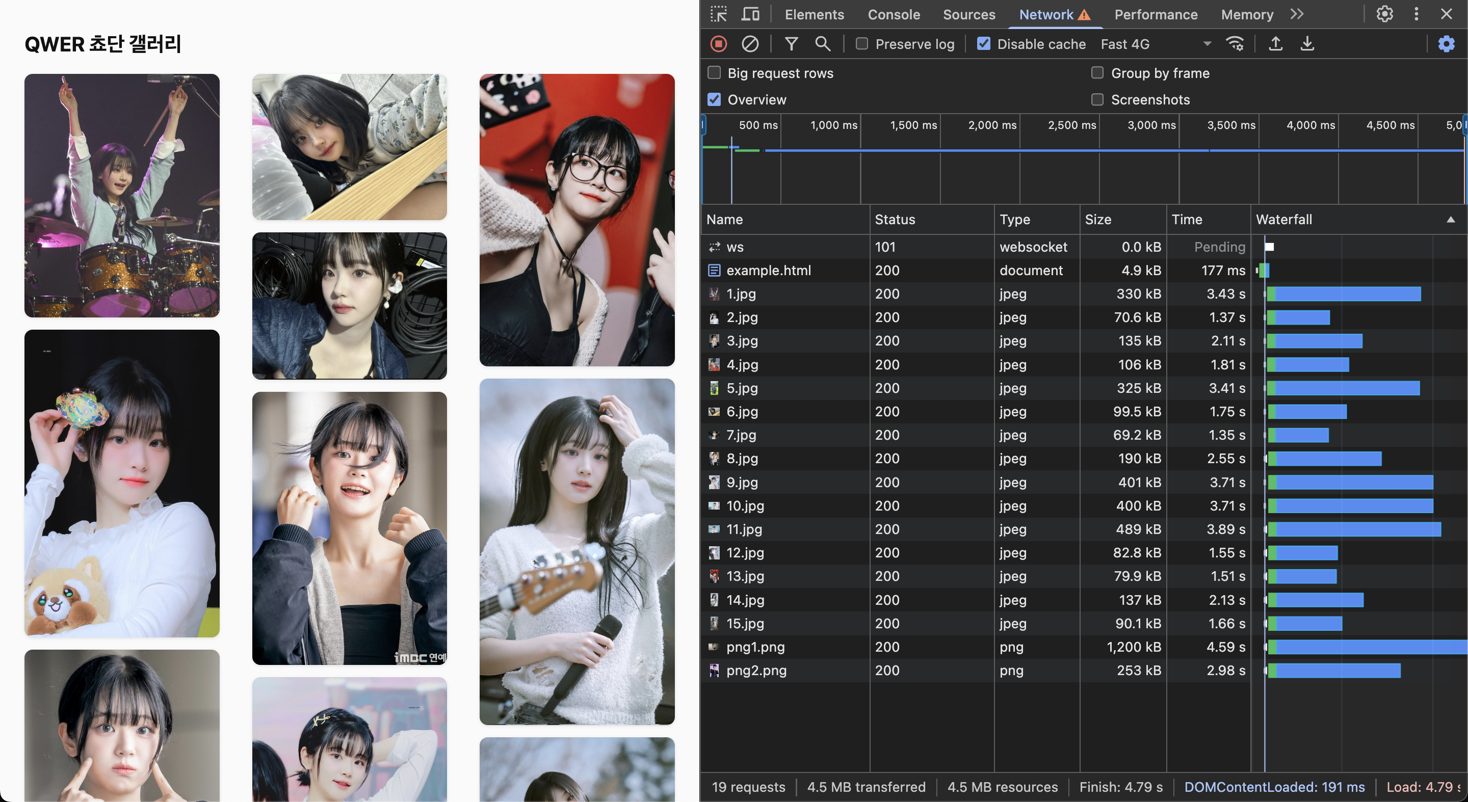 이제 맨 처음 문제가 됐었던 QWER 쵸단 갤러리에서 테스트해보자. 아까는 4G 쓰로틀링 환경에서 4.8초, 리소스 사이즈는 약 4.5MB에 LightHouse에선 LCP 수치에서 랜더링까지 약 4초가 걸렸었다.