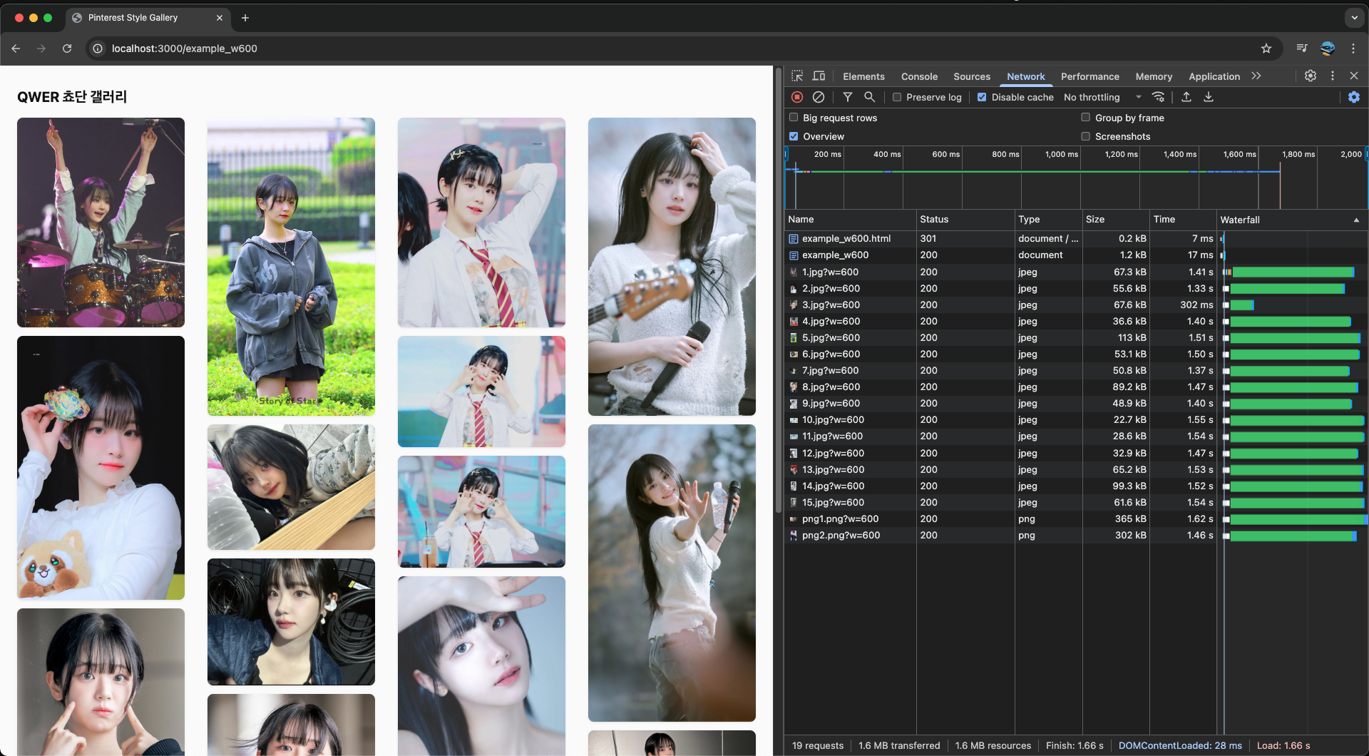 첫 로딩에 대해선 이미지 리사이징 프로세스 때문에 레이턴시가 있긴 한데, 새로고침해서 캐싱된 이미지를 가져와보면 매우 짧아진 모습을 볼 수 있다.