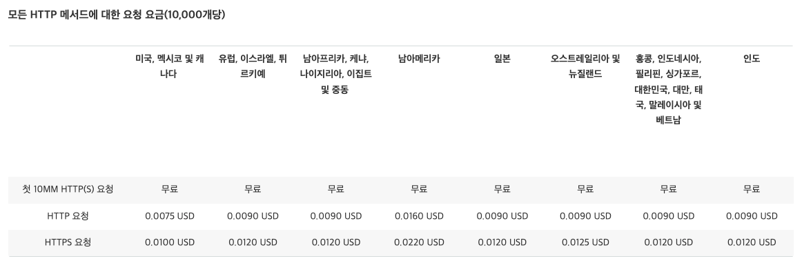 요금 표에선 10,000개의 요청을 기준으로 대한민국엔 0.0120$가 부과된다. 즉 , CloudFront HTTPS 요청 비용으론 1.2$가 부과된다.