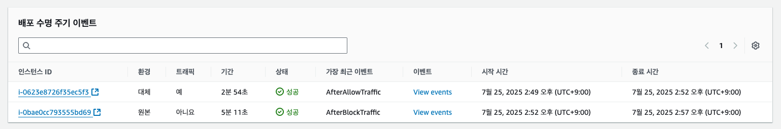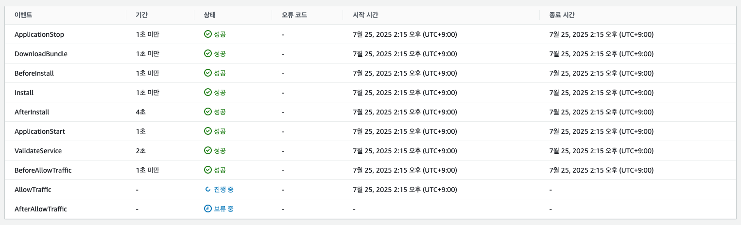또한 CodeDeploy에서 Lifecycle 이벤트에 대한 과정도 볼 수 있으며, In Place에선 없던 AllowTraffic과 AfterAllowTraffic이 보이는 것을 볼 수 있다.