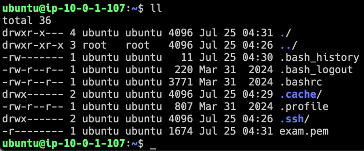 그리고 SSH로 접속한 뒤 AMI를 만들때 생성하였던 키페어 파일을 옮겨놓도록 하자.