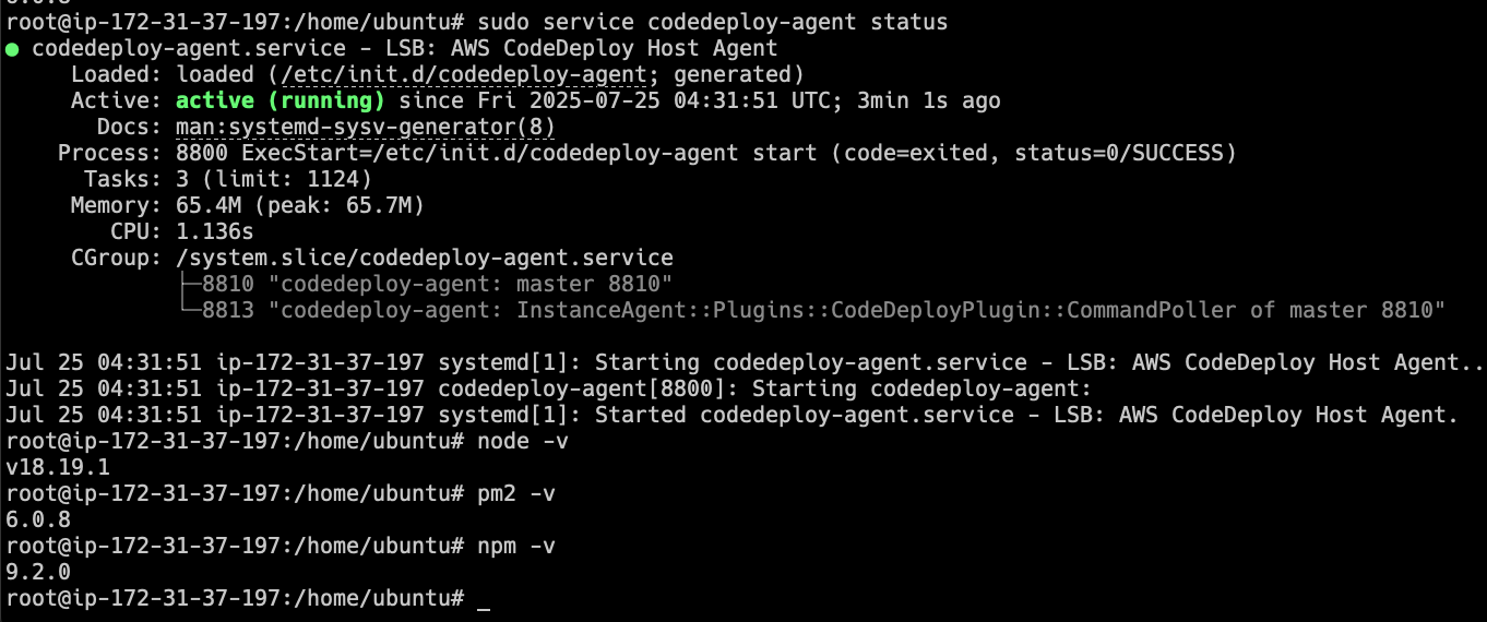 SSH로 접속한 다음 아래의 명령어를 통해 CodeDeploy와 NodeJS, NPM 등을 설치한다. (원활히 진행하기 위해 루트로 실행하는 것을 추천한다.)