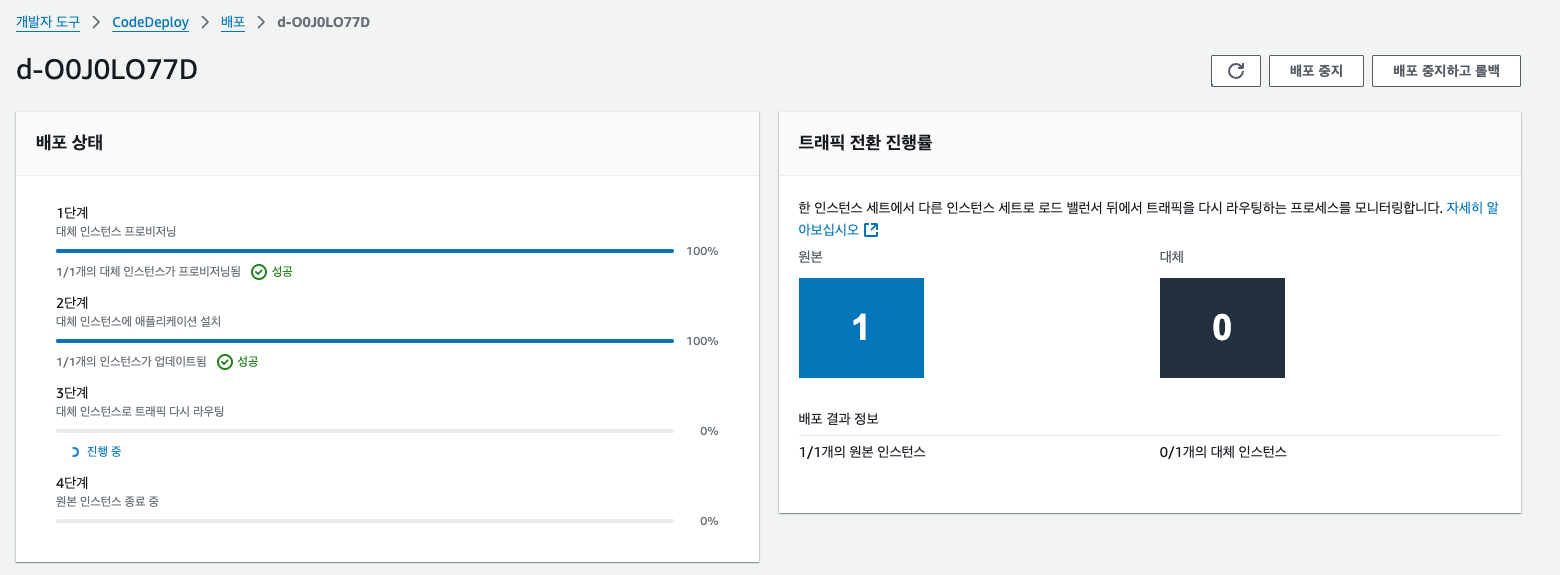 CodeDeploy에서 그 과정을 확인할 수 있으며, 아래와 같이 인스턴스와 오토스케일링 그룹이 새롭게 만들어지는 것을 볼 수 있다. (In Place에선 볼 수 없음)