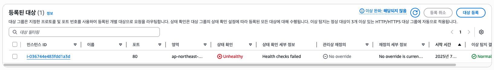 이제 로드밸런서까지 만들어졌으나 Health Check에서 실패할 것이다. 당연히 아직 코드를 올리진 않았기 때문.