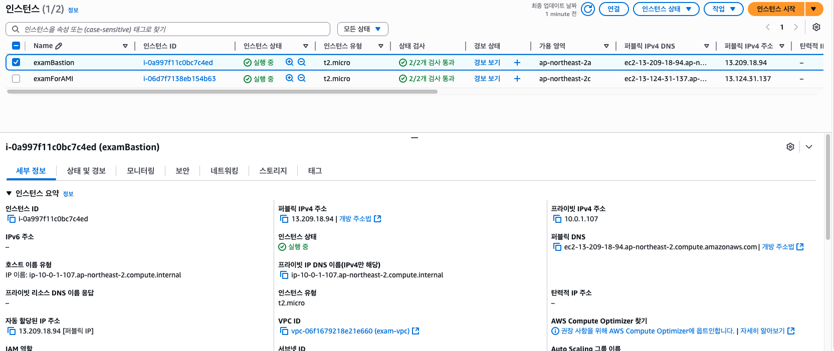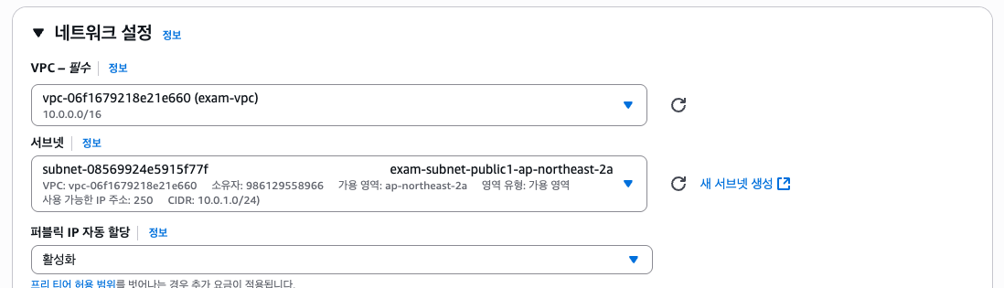 만들어둔 VPC의 퍼블릭 서브넷에 만들고 퍼블릭 IP를 할당한다.
