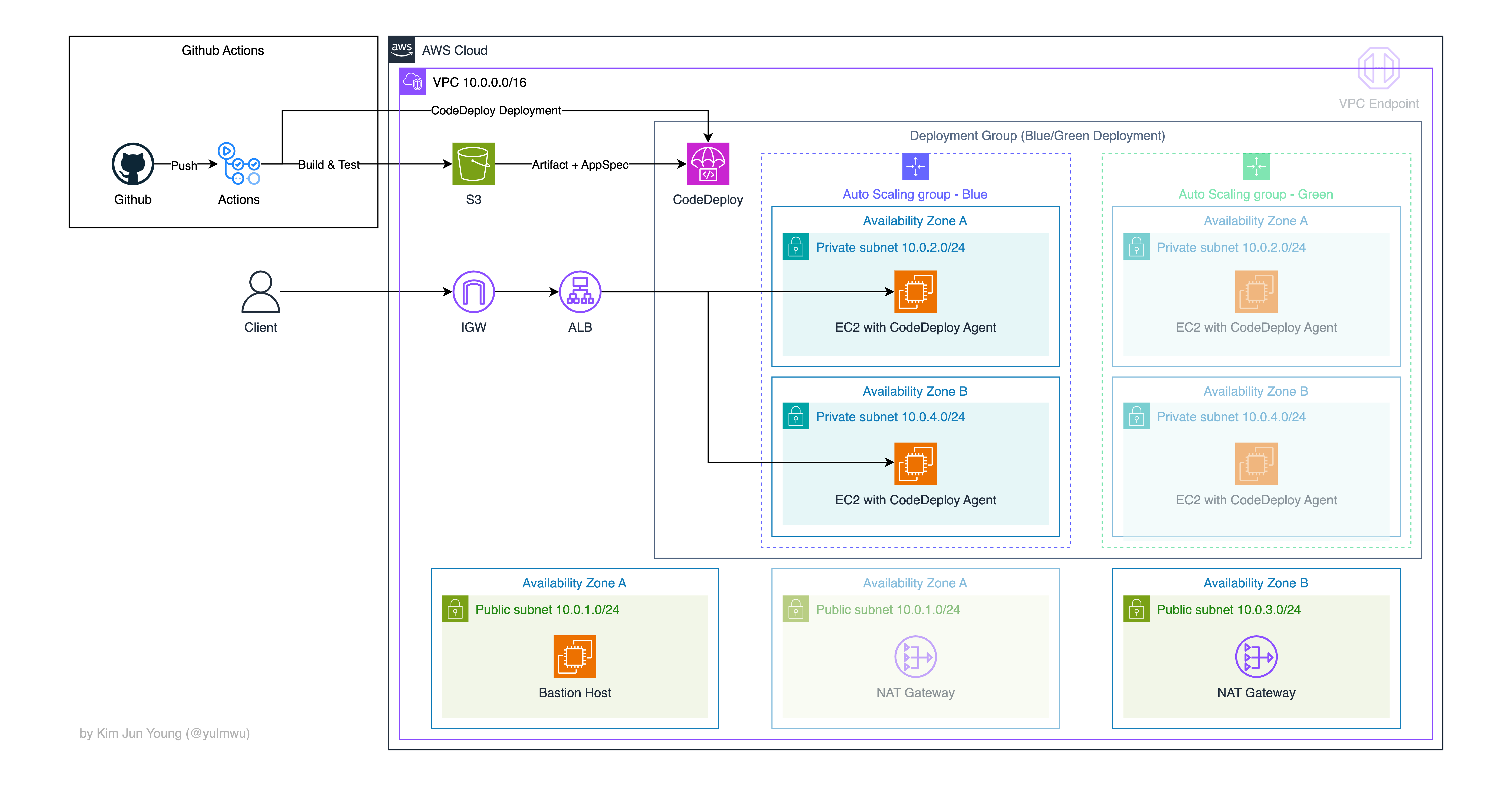 본 블로그의 [AWS] EC2 Deployment with CodeDeploy + Github Actions (Single EC2 Instance) 글과 연계되며, 단일 EC2 인스턴스에 CodeDeploy를 적용하는 것을 응용하여 오토 스케일링이 적용된 아키텍처에 CodeDeploy를 적용하는 포스팅입니다.