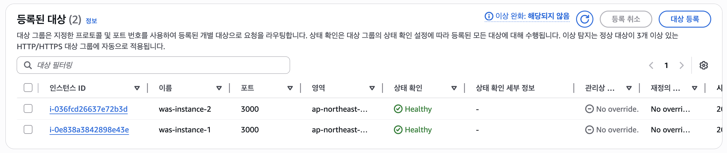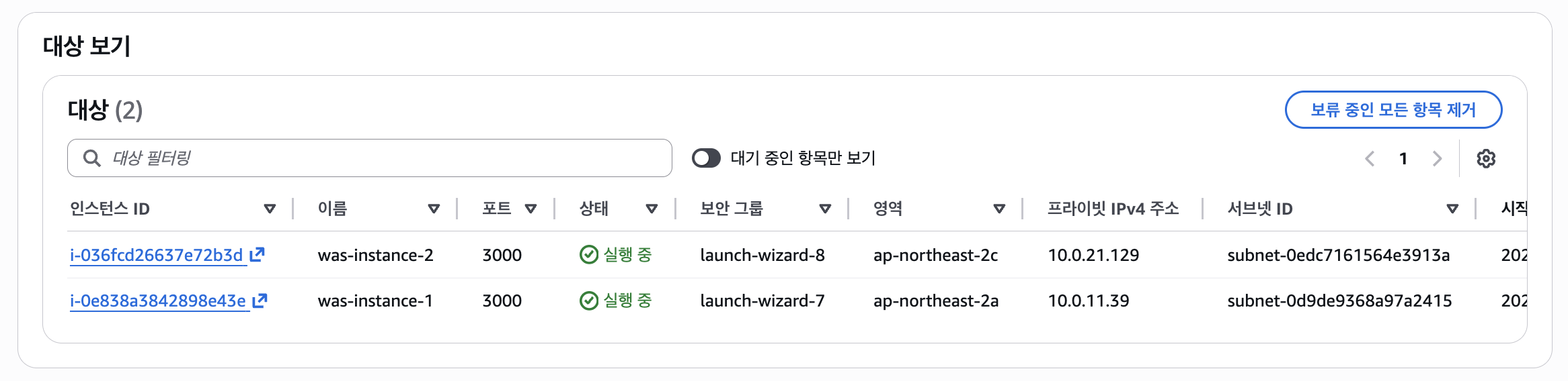 그리고 ALB를 구성해보자. 먼저 ASG 없이 타겟 그룹을 만들고 두 개의 WAS 인스턴스를 직접 등록하겠다.