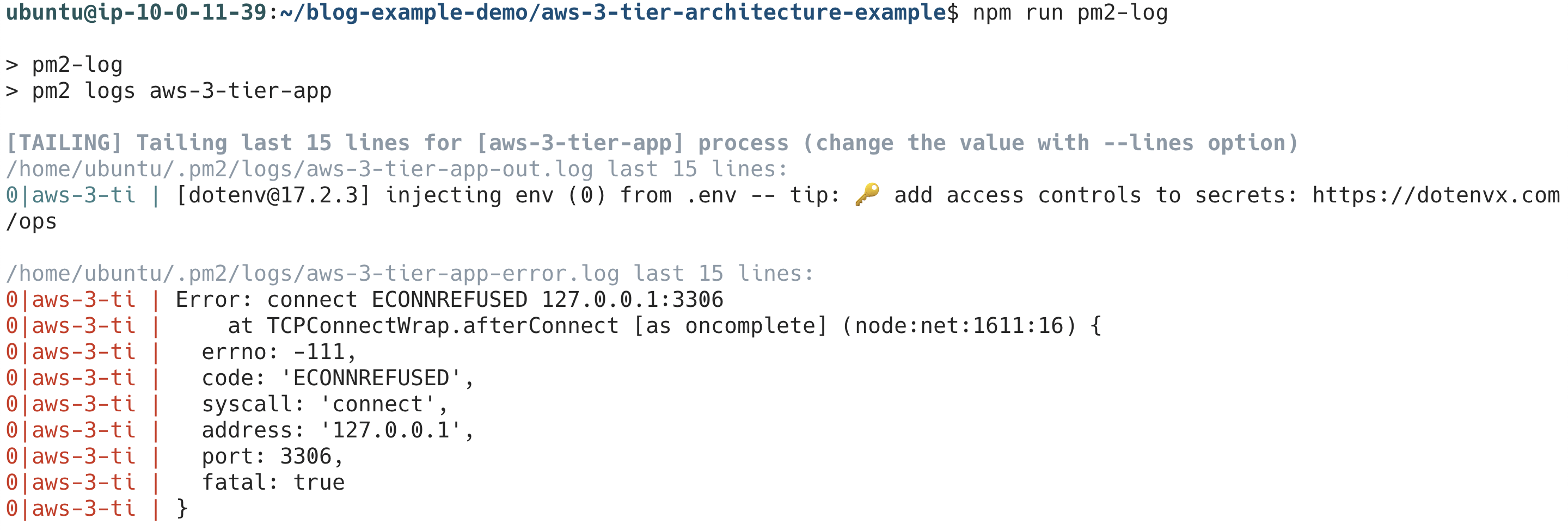 그런데 로그를 확인해보면 아래와 같은 에러가 발생하는 것을 확인할 수 있는데, 아직 DB 정보를 환경 변수로 설정하지 않았기 때문이다.