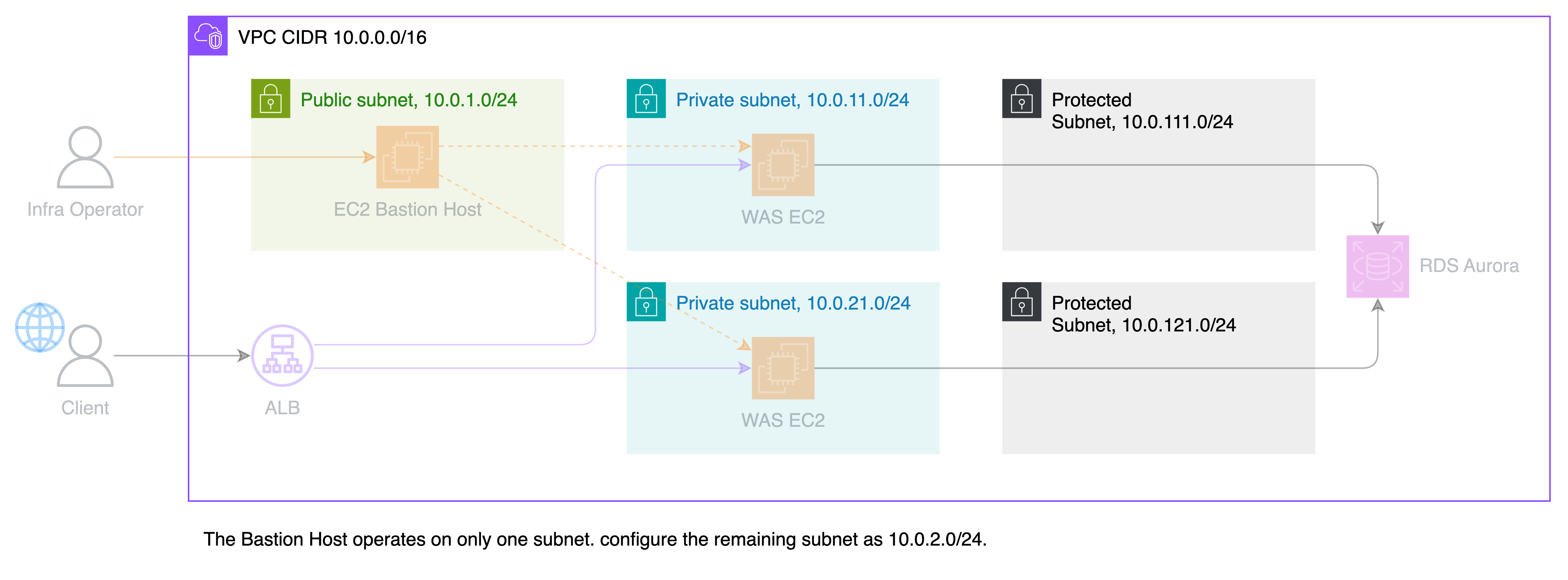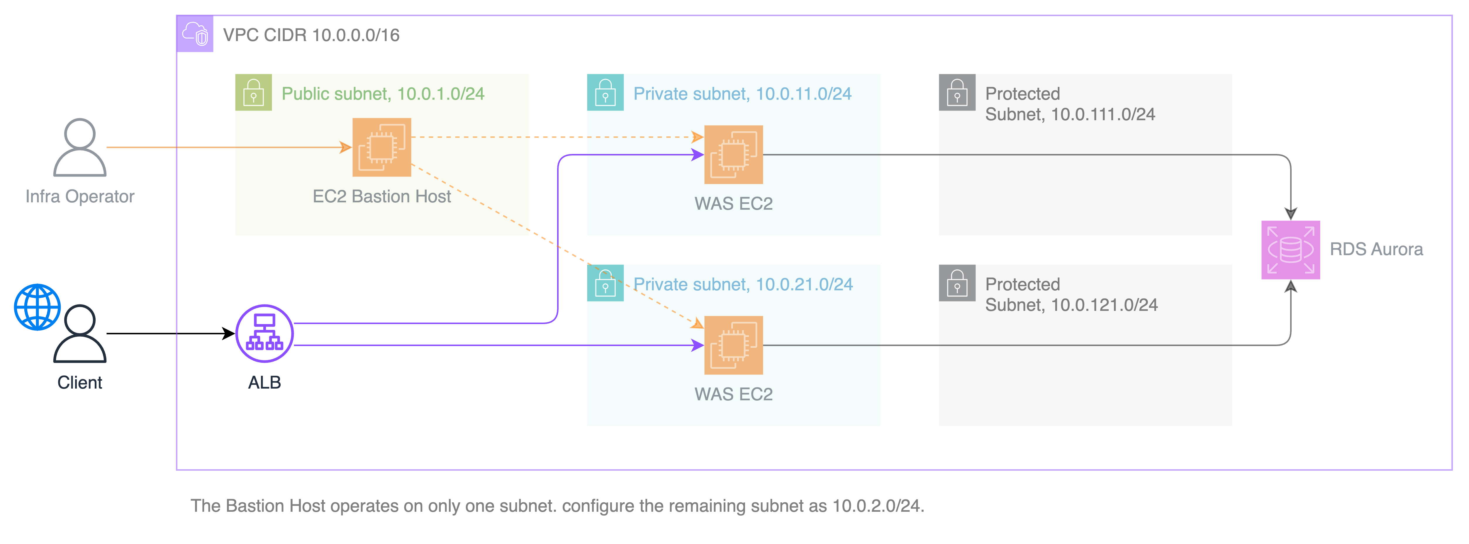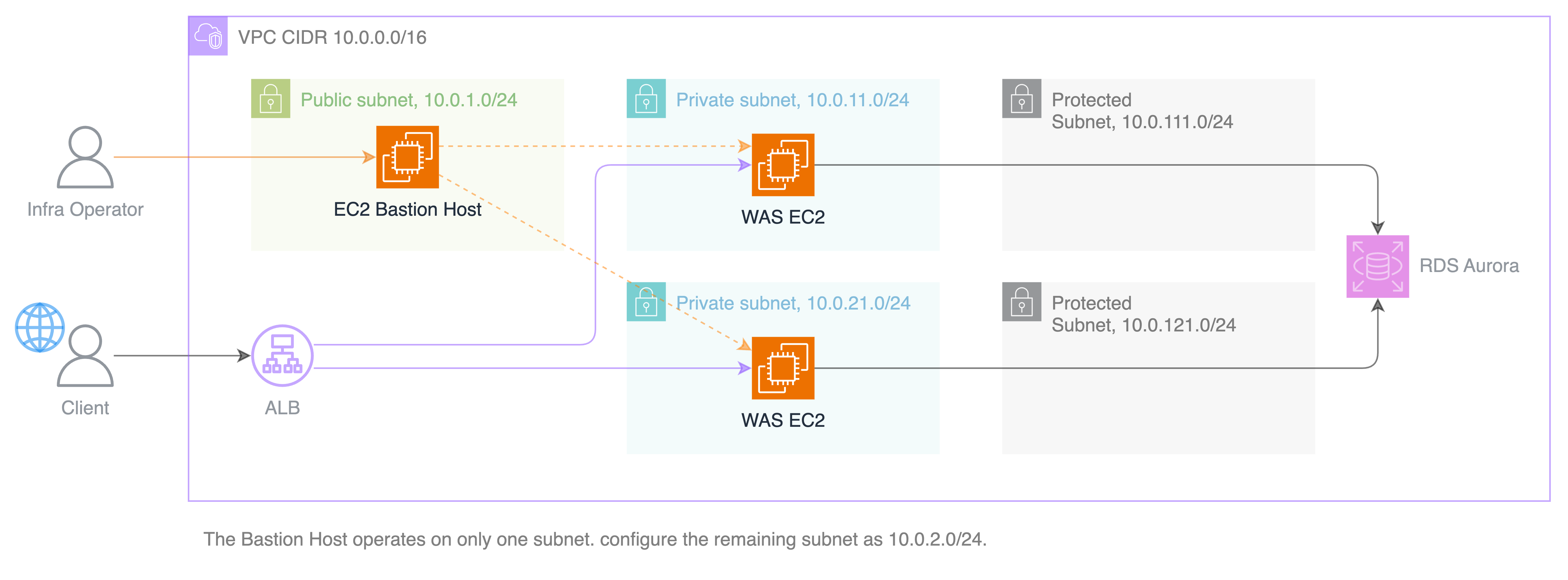 - ALB 뒤에 위치한 두 개의 WAS EC2 인스턴스에 대한 SSH 접근은 오로지 Bastion Host를 통해서만 접근해야 합니다.