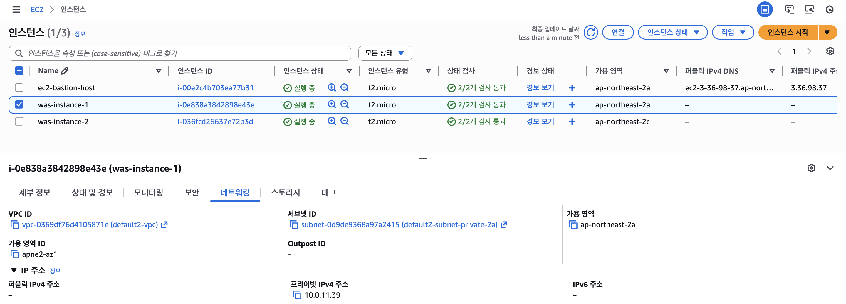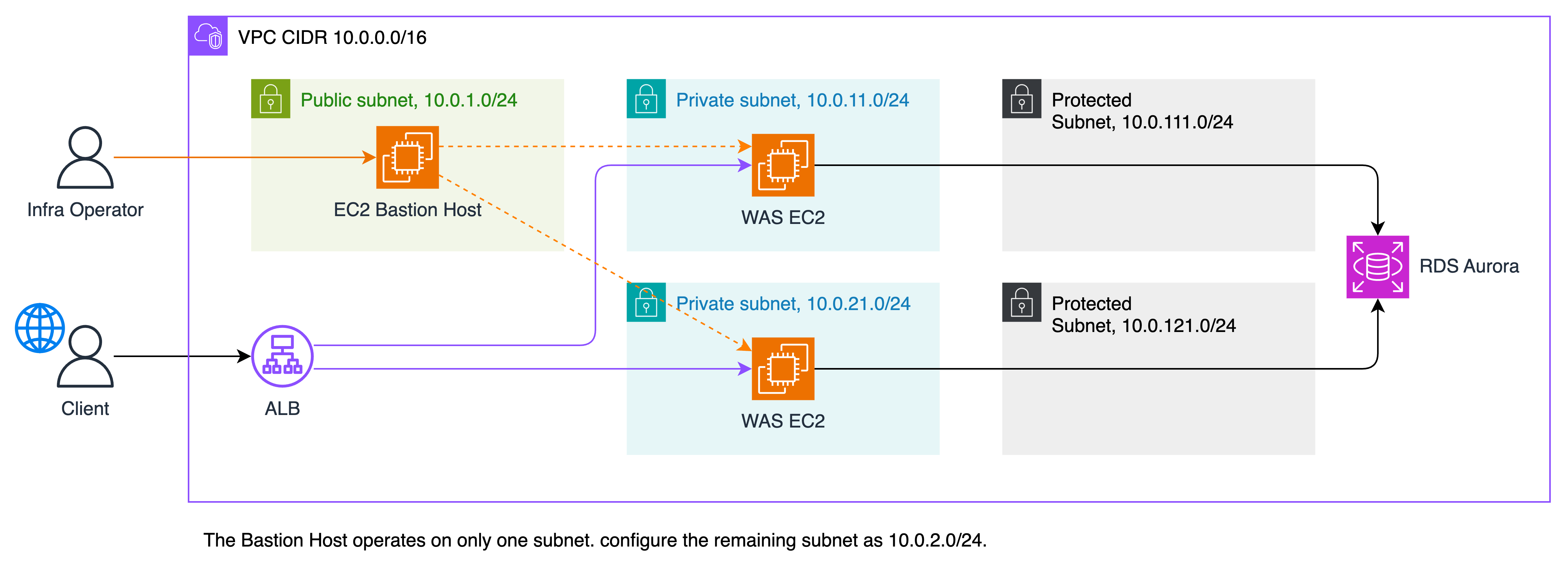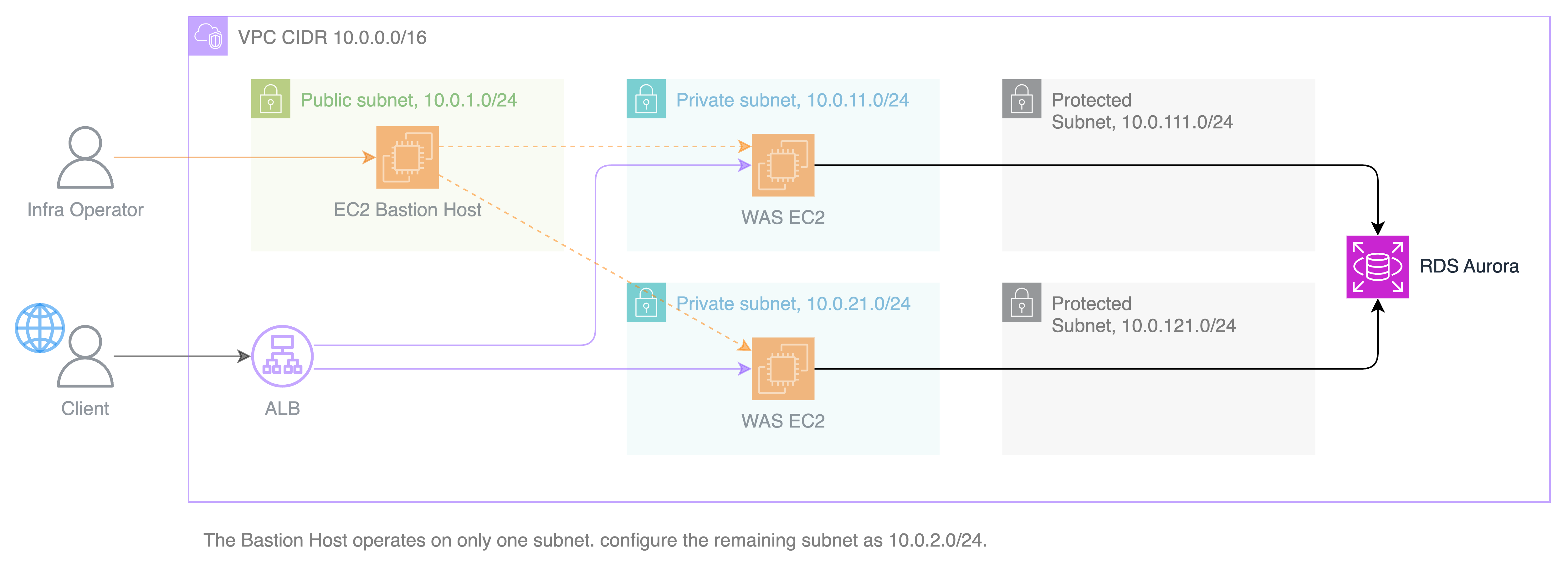 - ALB 뒤에 위치한 두 개의 WAS EC2 인스턴스에 대한 SSH 접근은 오로지 Bastion Host를 통해서만 접근해야 합니다.