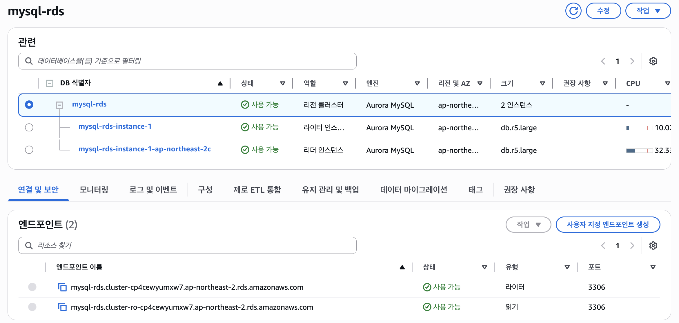 > mysql -h mysql-rds.cluster-cp4cewyumxw7.ap-northeast-2.rds.amazonaws.com -u admin -p