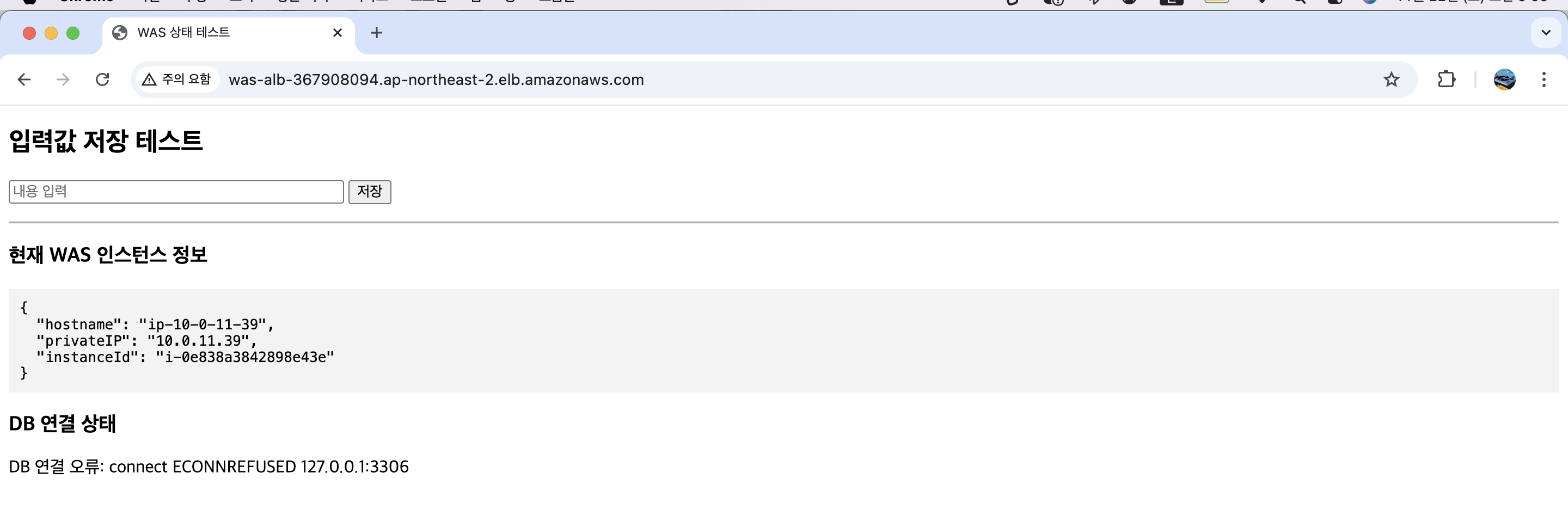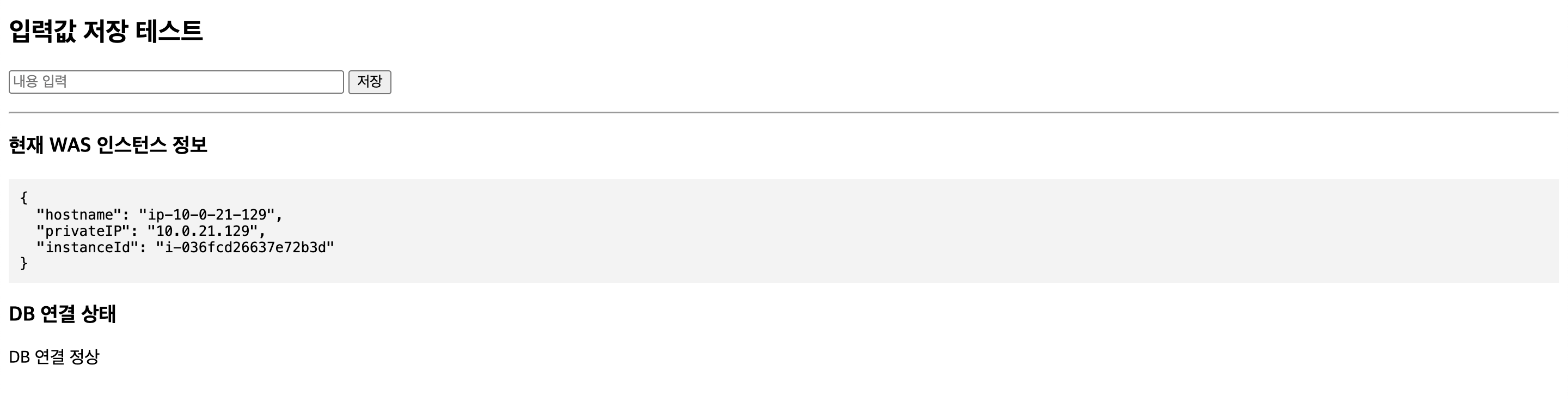 - ALB 뒤에 위치한 두 개의 WAS EC2 인스턴스는 로드밸런싱되어 번갈아 응답됩니다. 웹 페이지에서 새로고침을 반복했을 때 EC2 Instance ID 및 EC2 Private IP 값이 변경되어야 합니다.