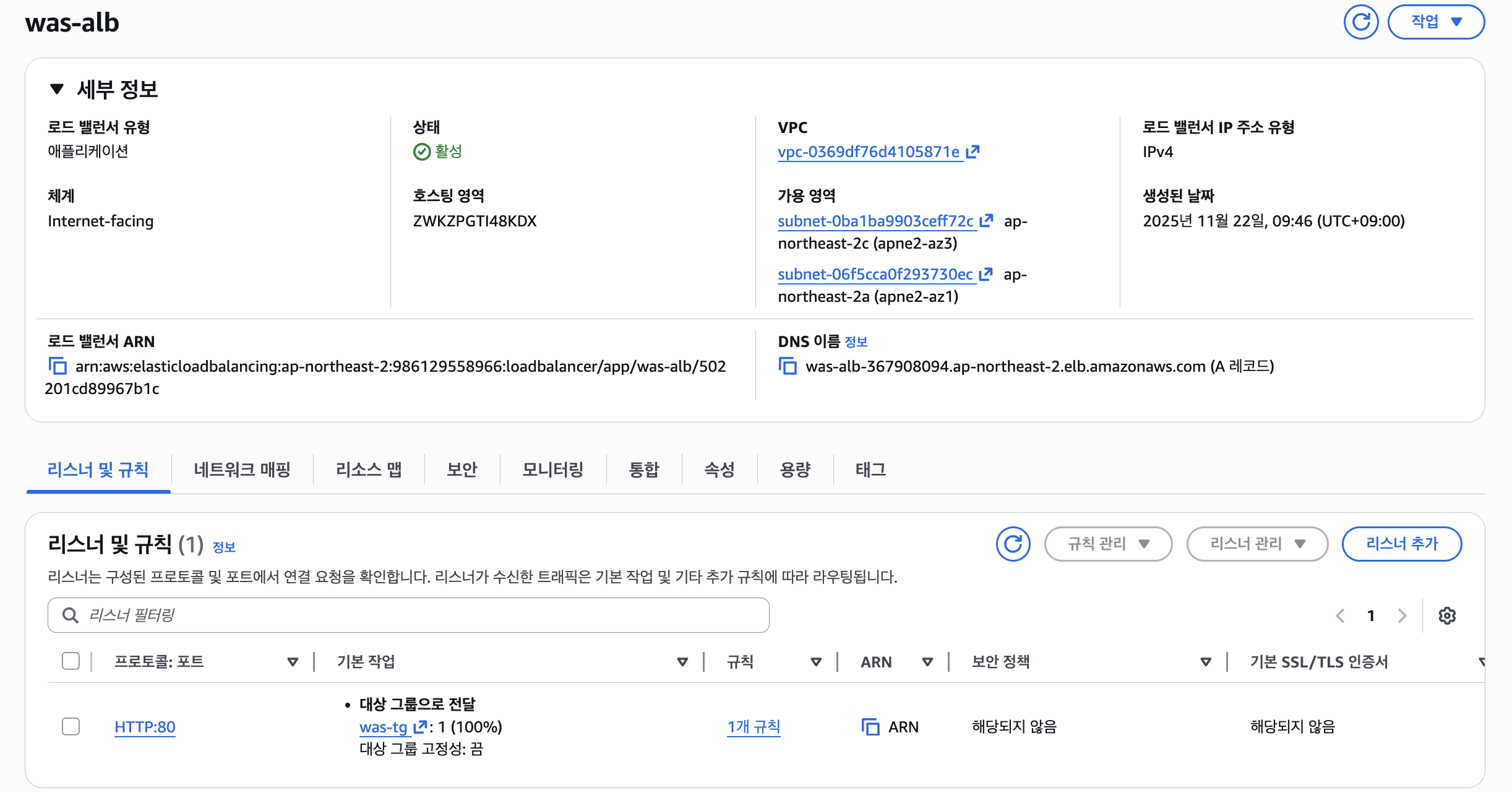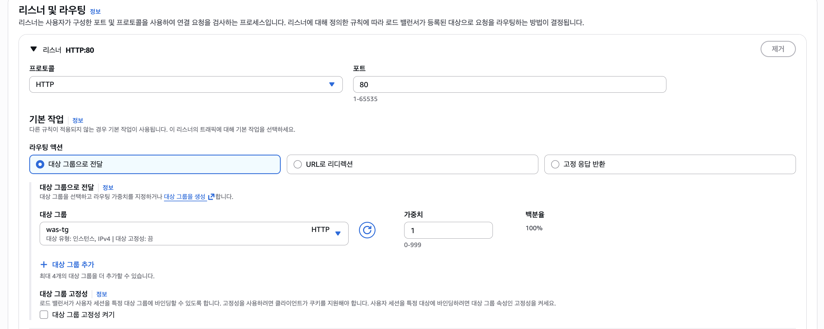 그리고 리스너 HTTP 80을, 대상 그룹은 만들어둔 was-tg를 선택한다.