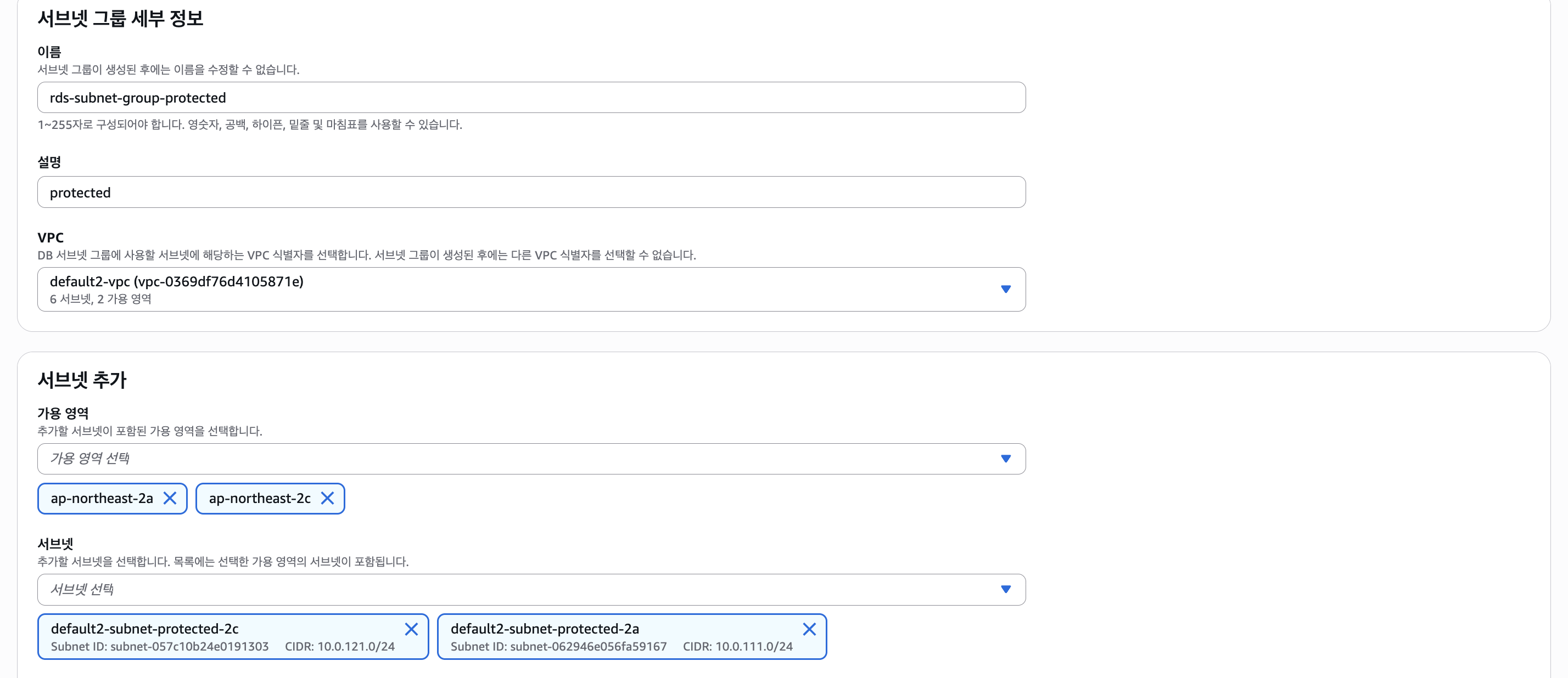 DB 인스턴스를 프로비저닝하기 전 서브넷 그룹을 만들고 Protected 서브넷에만 올라가도록 구성하자.