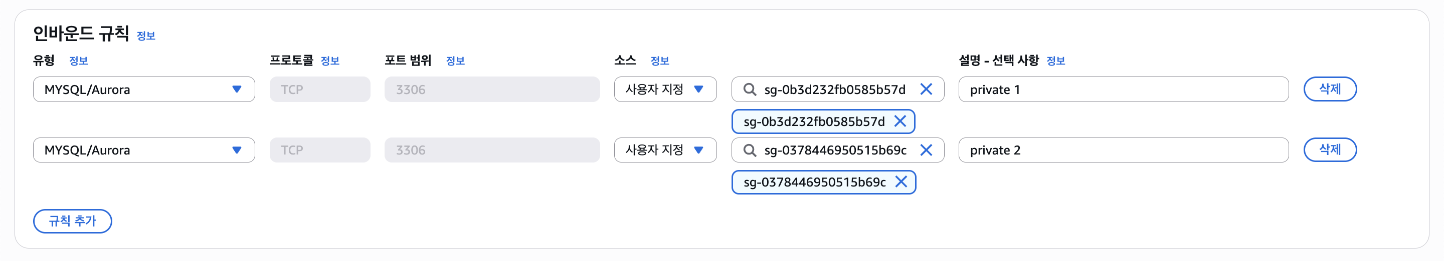 - RDS 인스턴스는 반드시 Protected Subnet에만 생성되어야 하며, WAS를 제외한 어떠한 대상과도 통신할 수 없어야 합니다.
