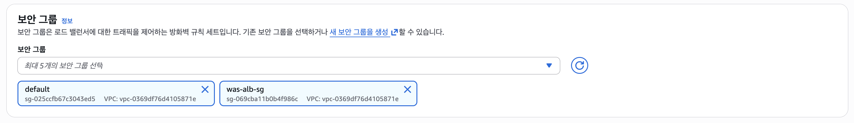 보안 그룹은 아래와 같은 보안 그룹을 만들고 WAS 인스턴스에 연결한 보안 그룹을 선택한다.