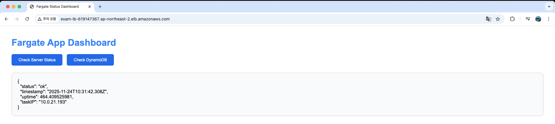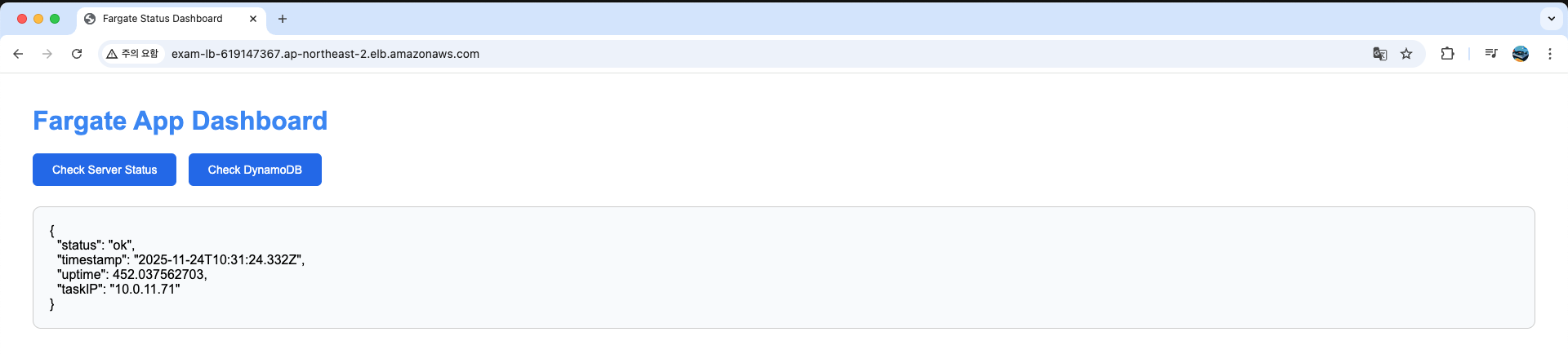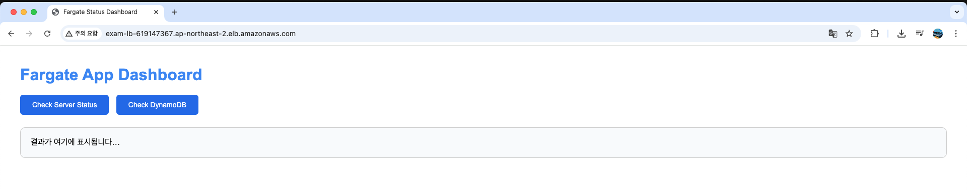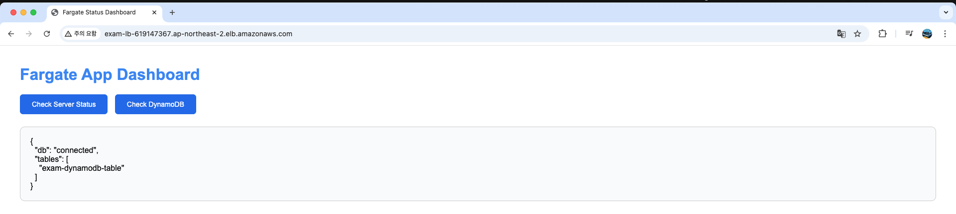 - Check DynamoDB 버튼을 클릭했을 때 DynamoDB 테이블 목록이 보여야 합니다. Fargate Task는 Private 서브넷에서 NAT Gateway를 통해 정상적으로 DynamoDB API에 접근함을 의미합니다. (테이블 이름은 임의로 설정하십시오)