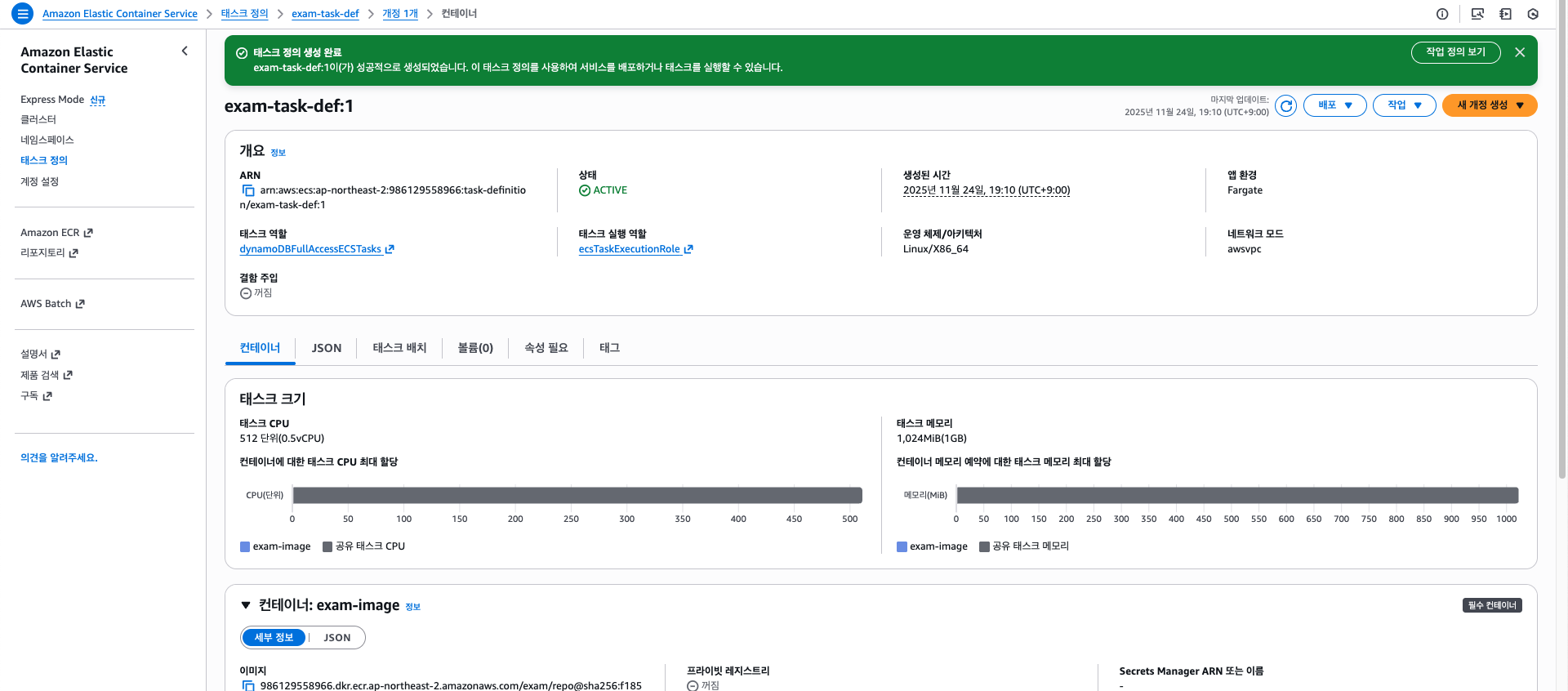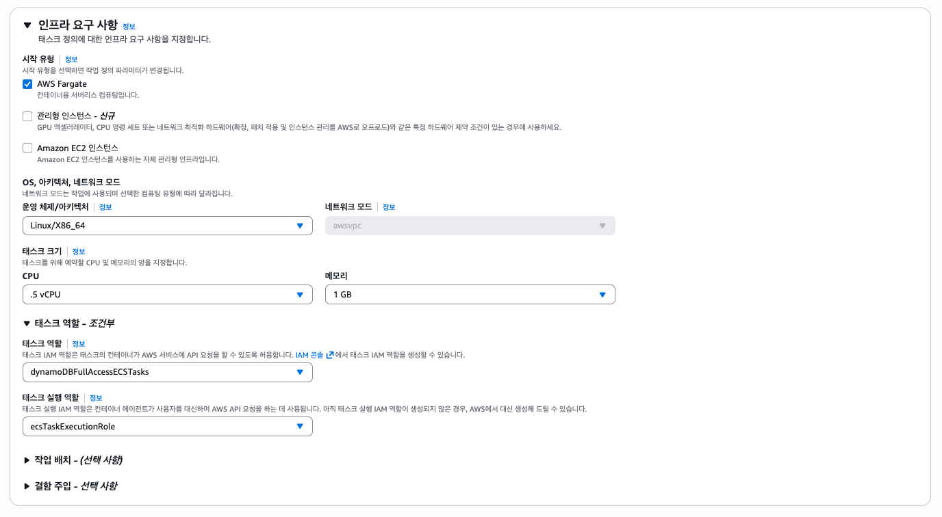 그리고 컨테이너에서 DynamoDB에 접근하기 위한 IAM 역할을 넣어주자. 아래의 "태스크 실행 역할"은 ECS 에이전트가 이미지를 가져오거나 로그를 CloudWatch 등으로 보내기 위해 사용하는 IAM 역할로, 다른 목적이다.