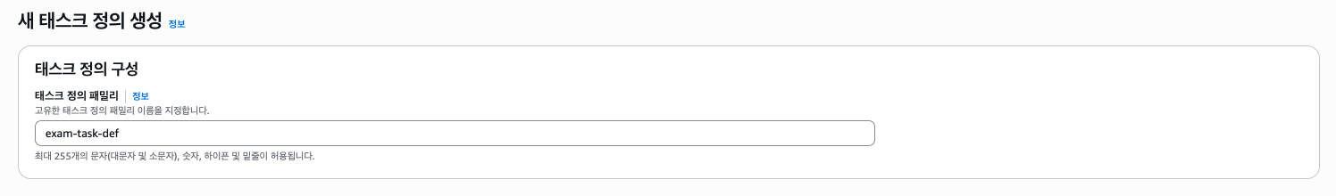 위와 같이 Fargate 전용 클러스터를 만들었다. 이제 서비스를 만들어서 컨테이너를 배포하기 전, 태스크 정의부터 해보자. 태스크 정의는 EKS를 비유하자면 Pod Spec과 비슷하다.