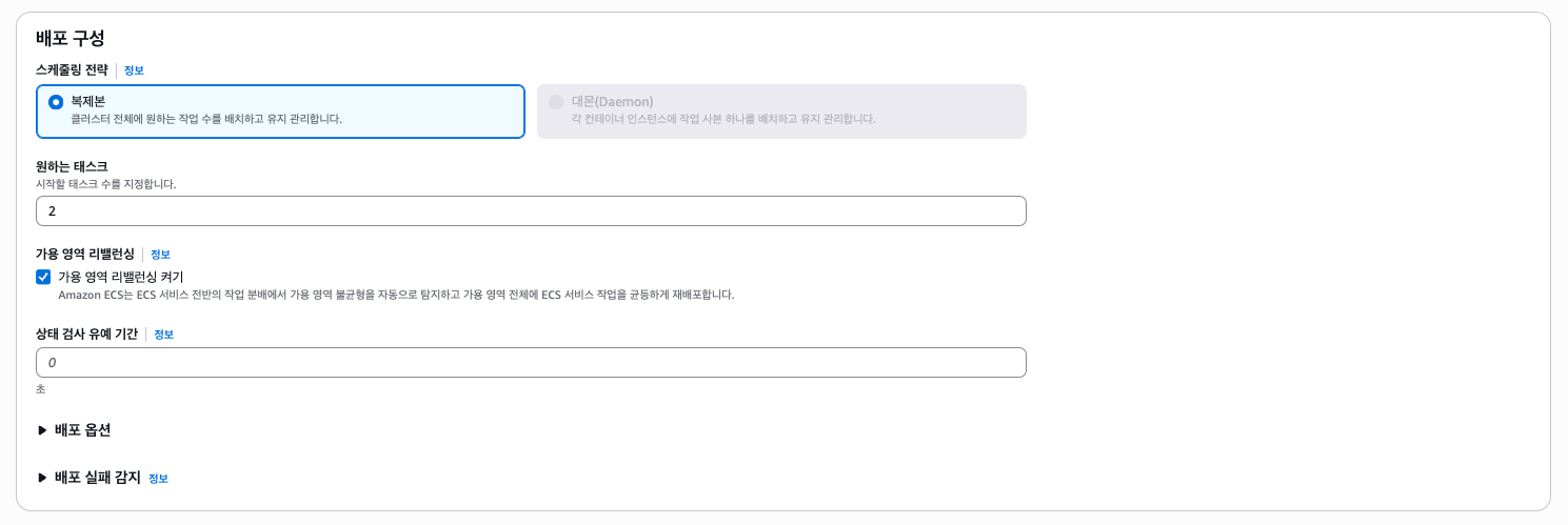 배포 구성은 최소 2개의 태스크로 구성하고, 오토 스케일링은 따로 구성하진 않았다.