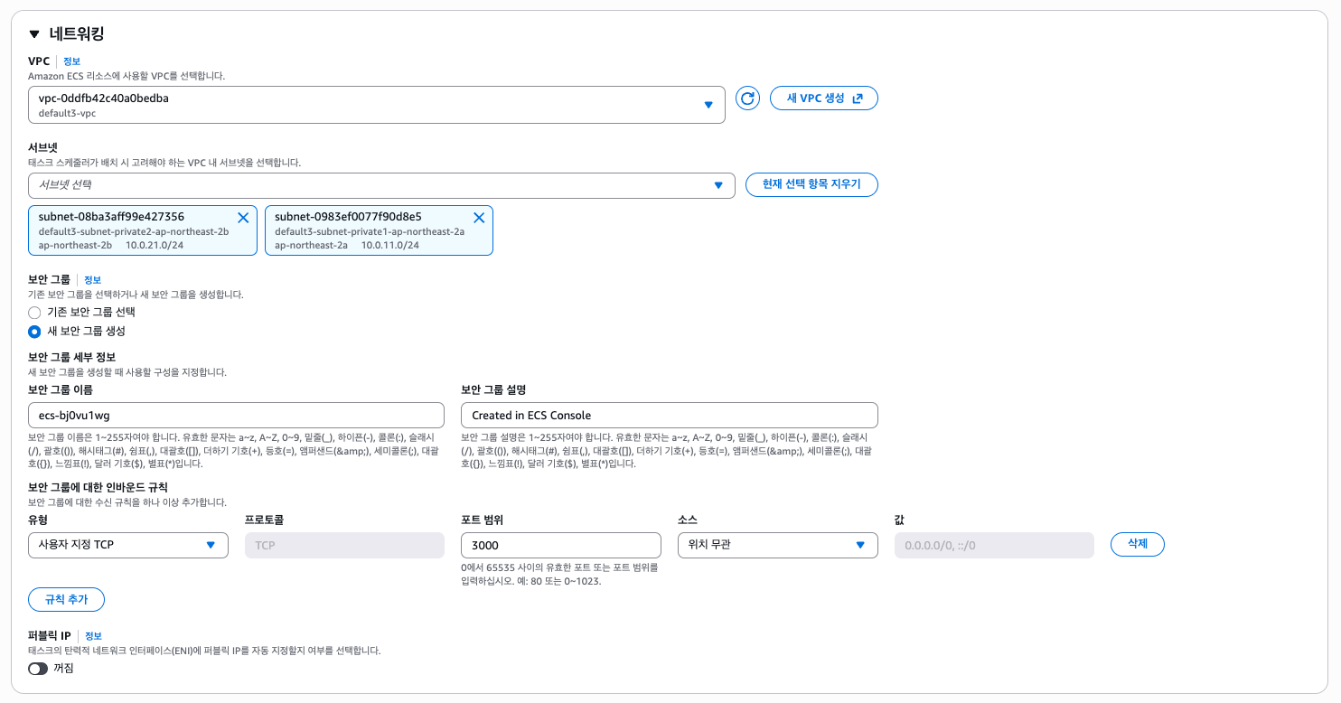 네트워킹에선 두 개의 Private Subnet을 선택해주고, Public IP는 당연히 꺼두었다.