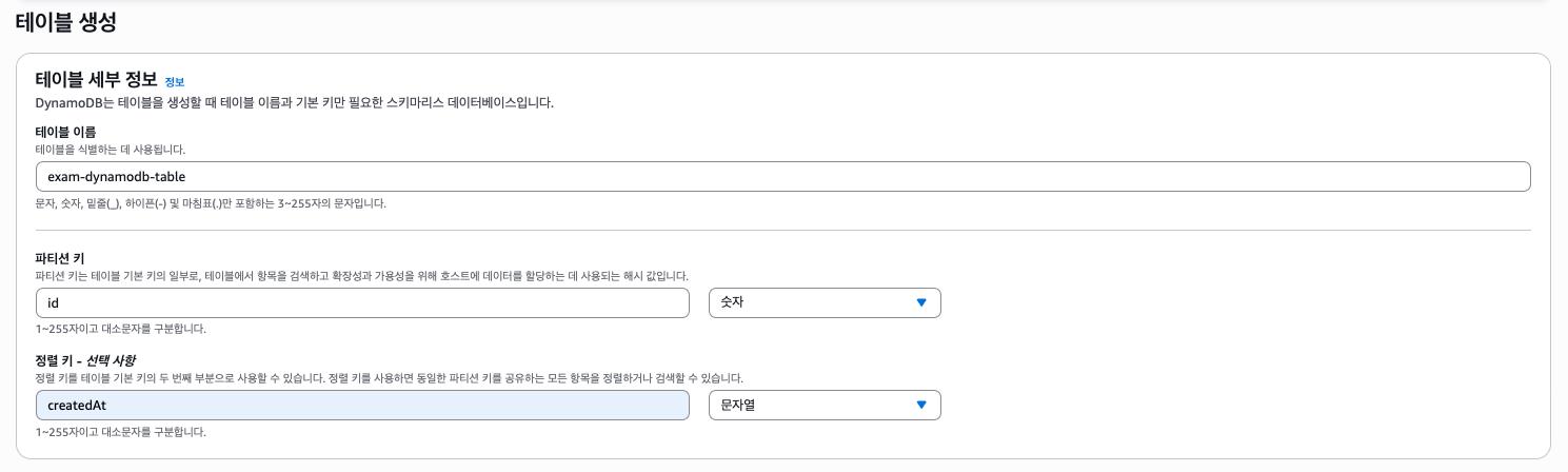 과제의 목적이 ECS Fargate Task가 DynamoDB API에 접근할 수 있는지를 확인하는 것이기 때문에 테이블만 만들어두면 된다.