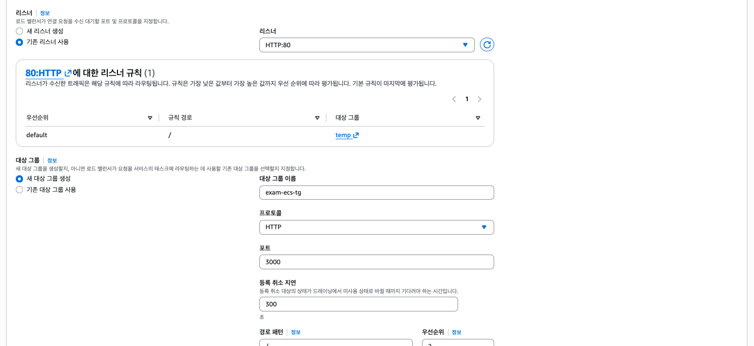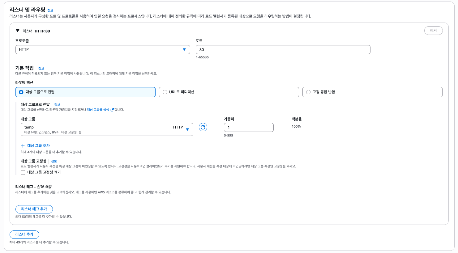 위와 같이 대상 그룹을 만들도록 하고 HTTP 80번 리스너에 연결하도록 한다.