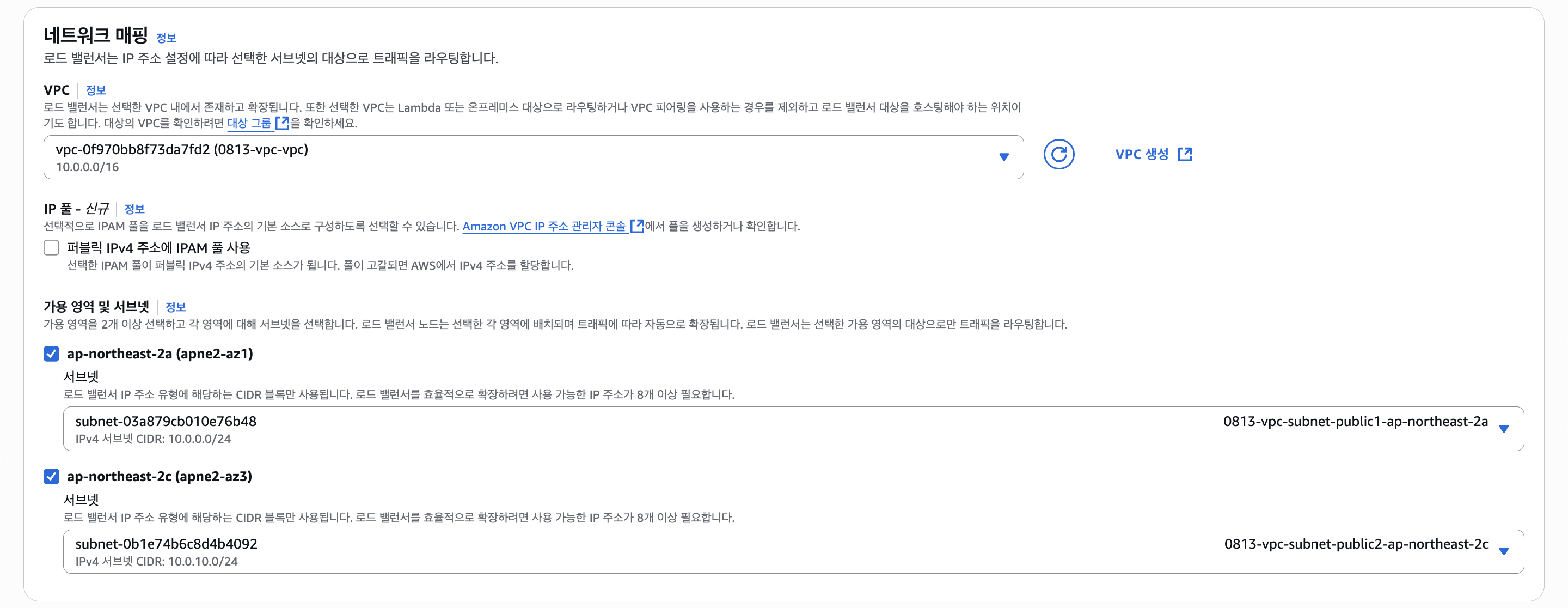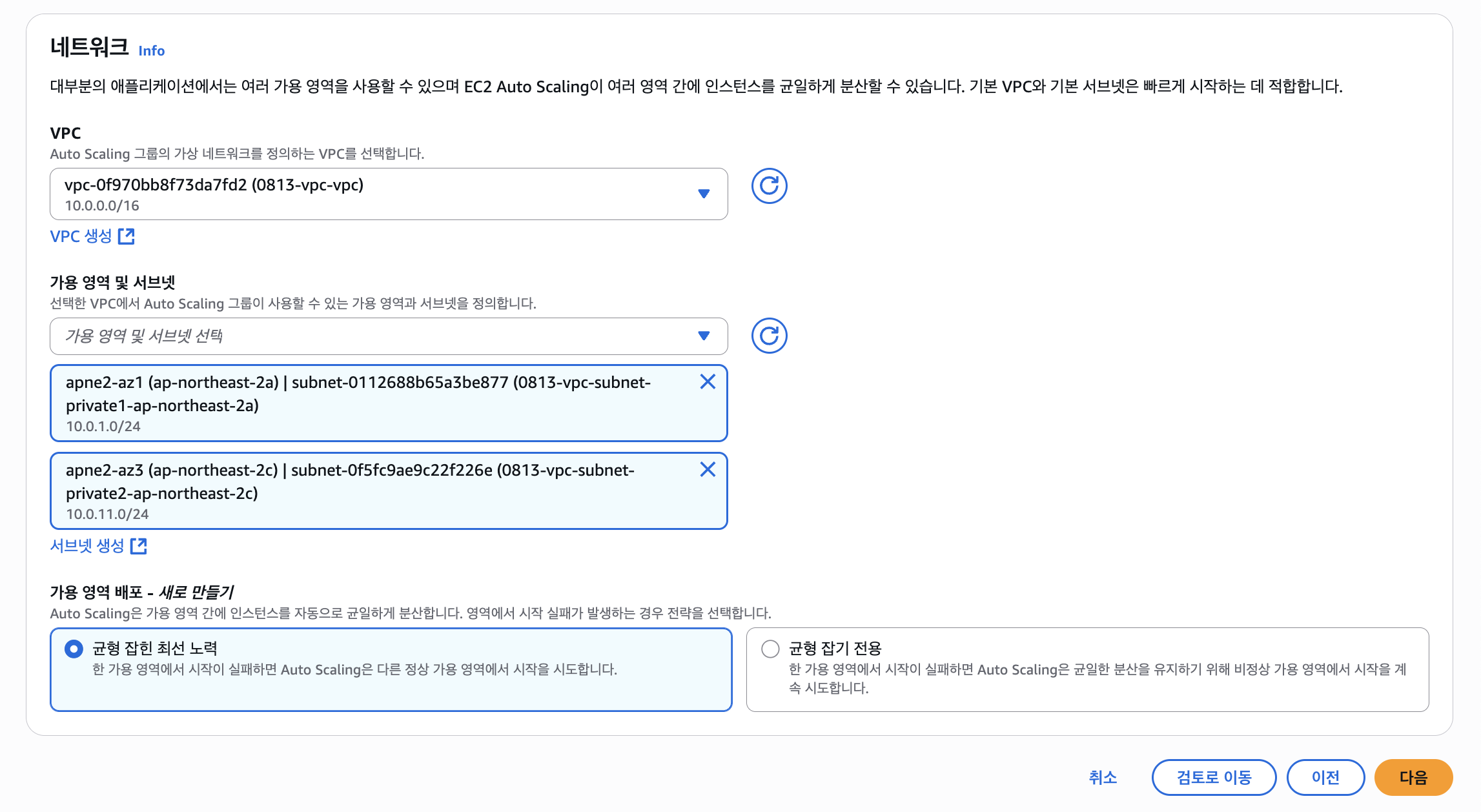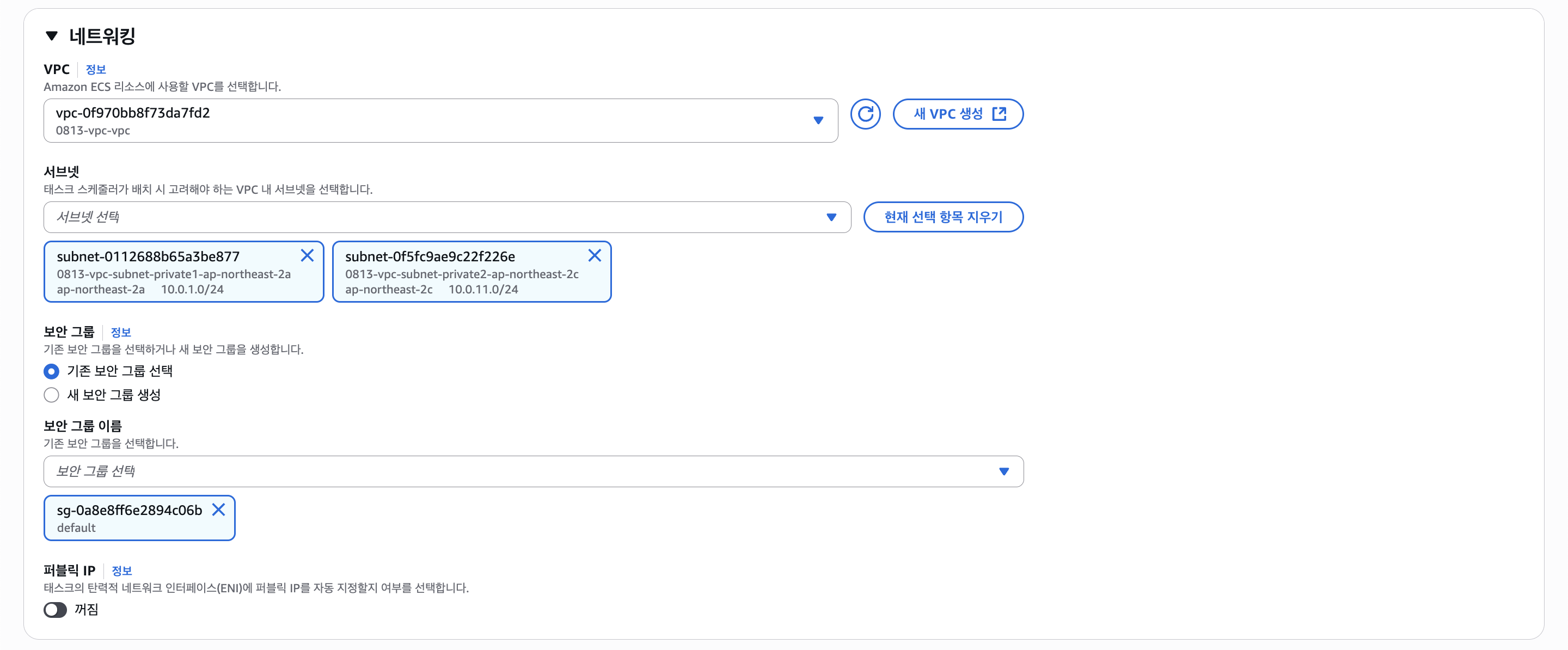 네트워크 설정에서 VPC와 프라이빗 서브넷 A, B를 선택하고, 퍼블릭 IP는 꺼주자. 돈나간다.