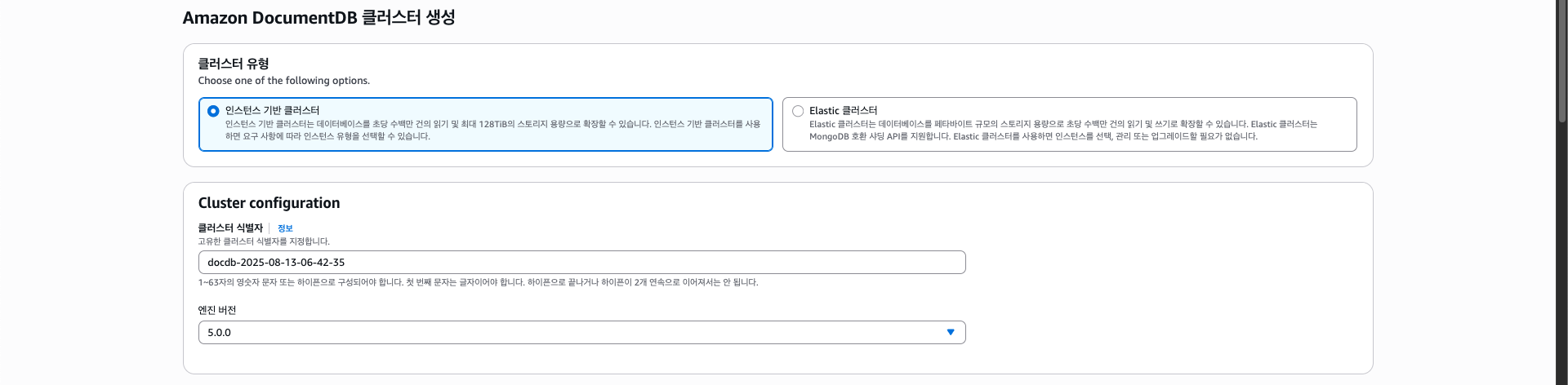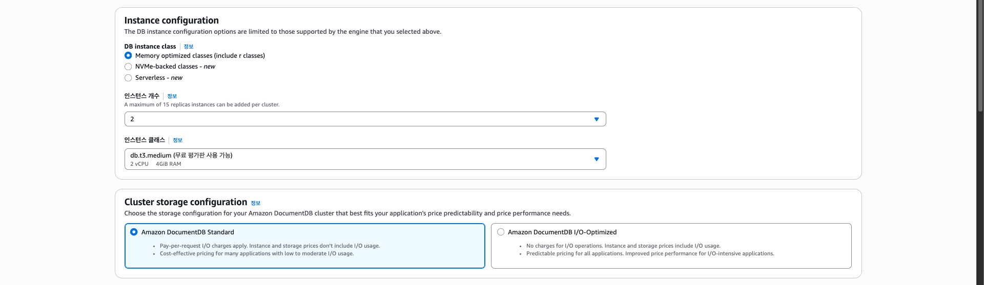 클러스터의 인스턴스 개수는 Primary + Replica 2개로 선택해주었다.