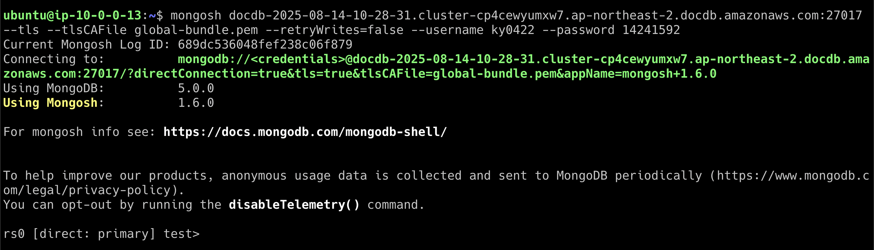 Bastion Host에서도 잘 접속되는 것을 볼 수 있다. (DocumentDB, Redis 각각 보안 그룹에서 27017, 6379 포트를 열어줘야 한다)