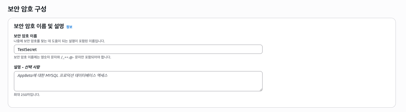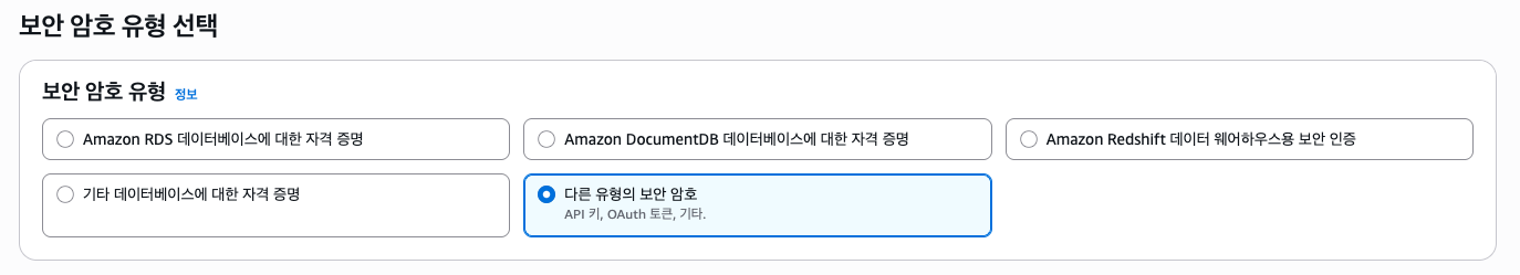 보안 암호 유형 선택에선 다른 유형의 보안 암호를 선택한다. RDS나 DocumentDB 등의 자격 증명을 만들 수 도 있는데, 이 포스팅에선 다루지 않는다.