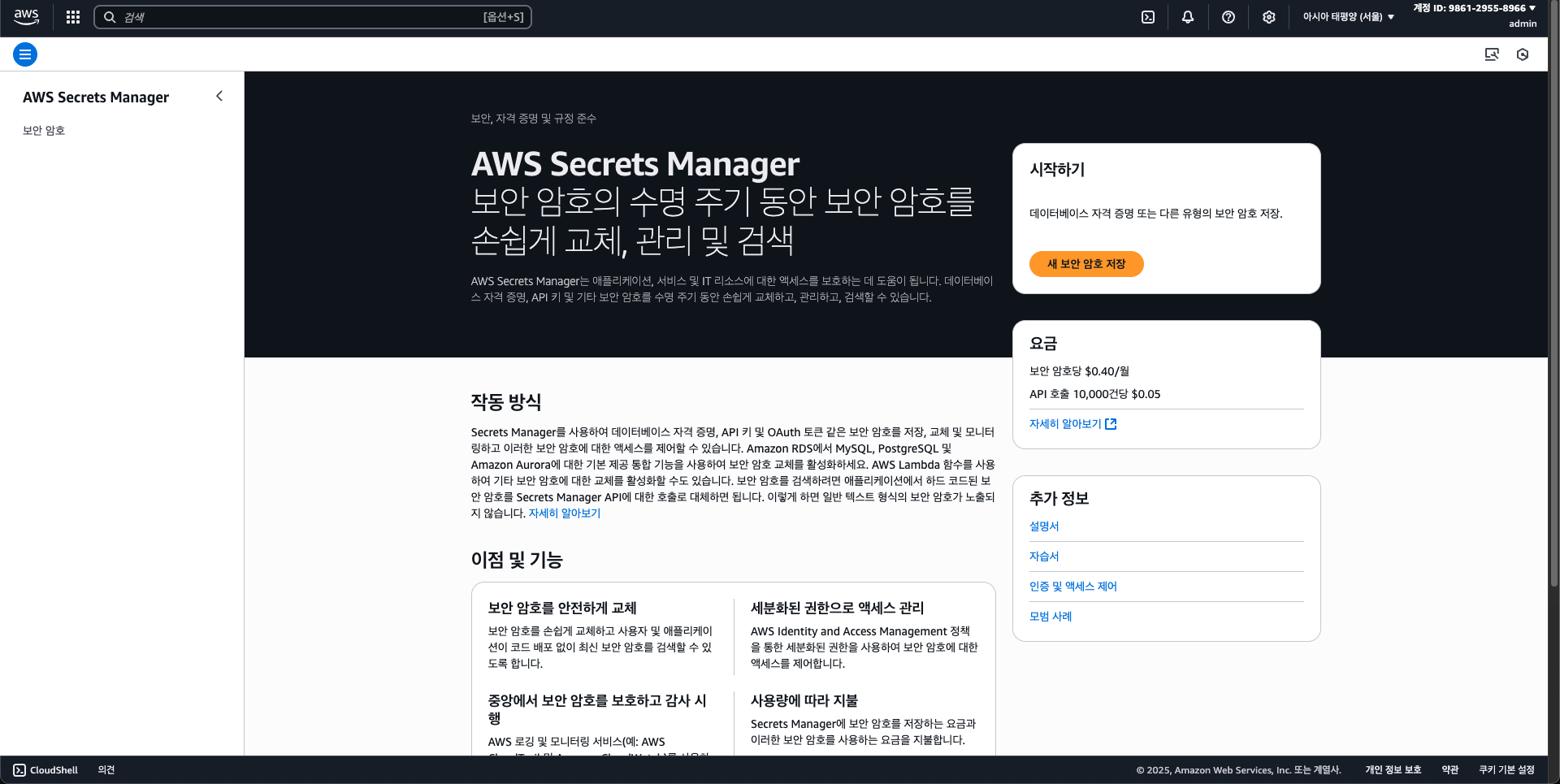 첫번째로 Secret Manager 설정부터 해보자. 참고로 시크릿 하나당 월 0.4$가 고정적으로 청구되고 API 요청 수에 따라 추가적으로 청구되는데, 계정에서 시크릿 생성 후 처음 30일은 무료이니 참고하자. (시크릿 안에 여러개의 키가 있는 구조)
