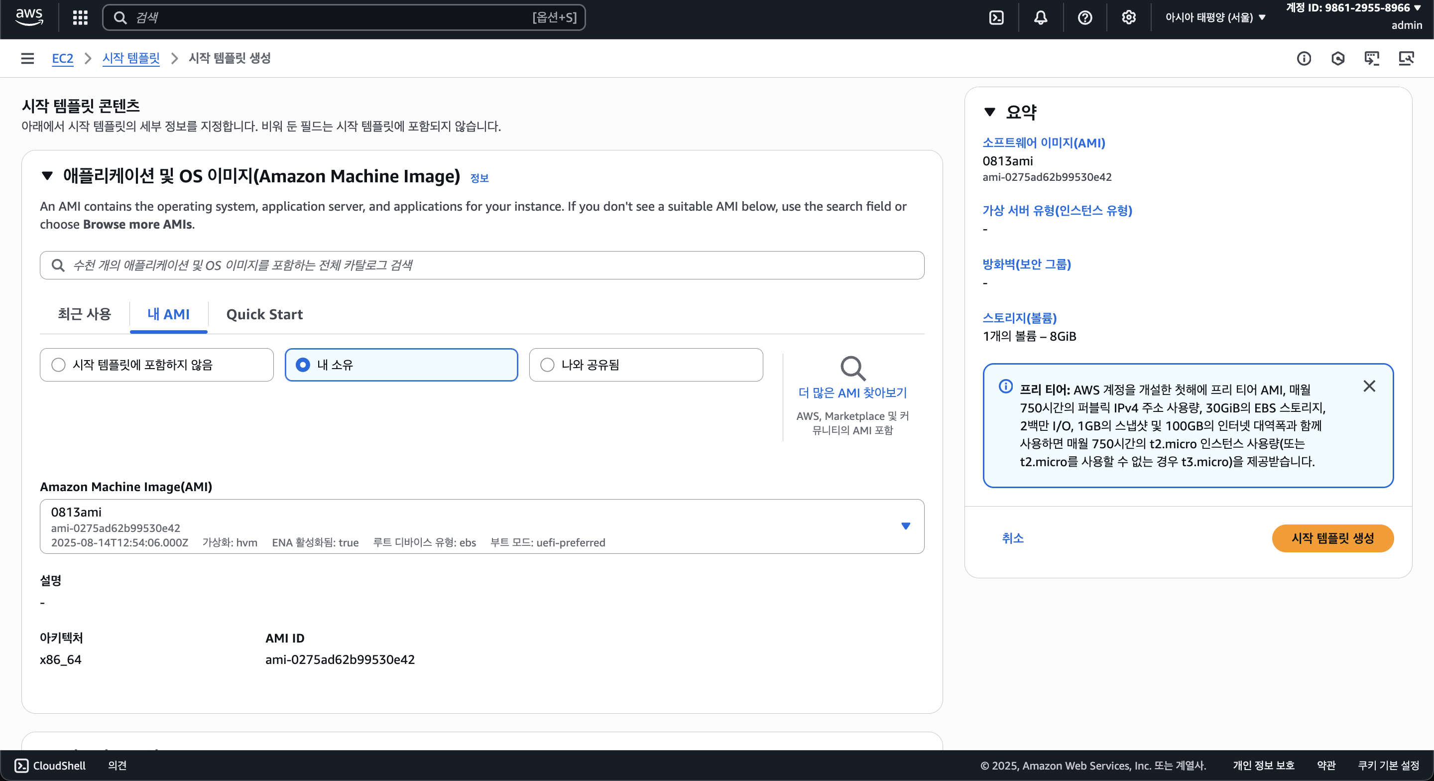 AMI 이미지는 방금 만들었던 AMI로 선택한다. 그 외(네트워크 등) 설정은 따로 건들지 않았다. 가만히 냅두면 추후 ASG에서 생성할 때 알아서 맞춰준다.