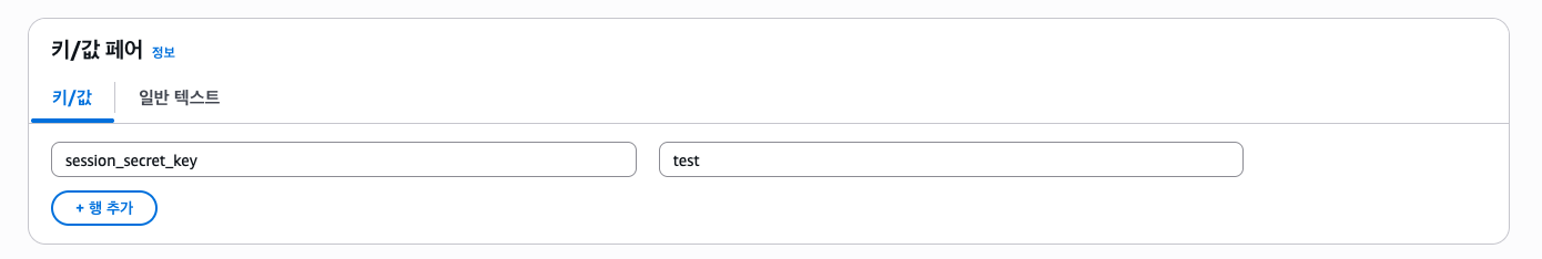 키엔 session_secret_key, 값엔 아무 값이나 넣는다. (추후 랜덤한 문자열로 로테이션되게 설정할 예정)