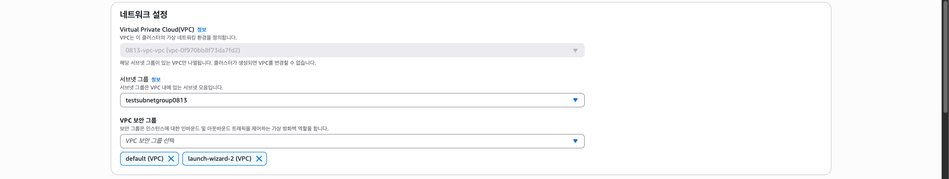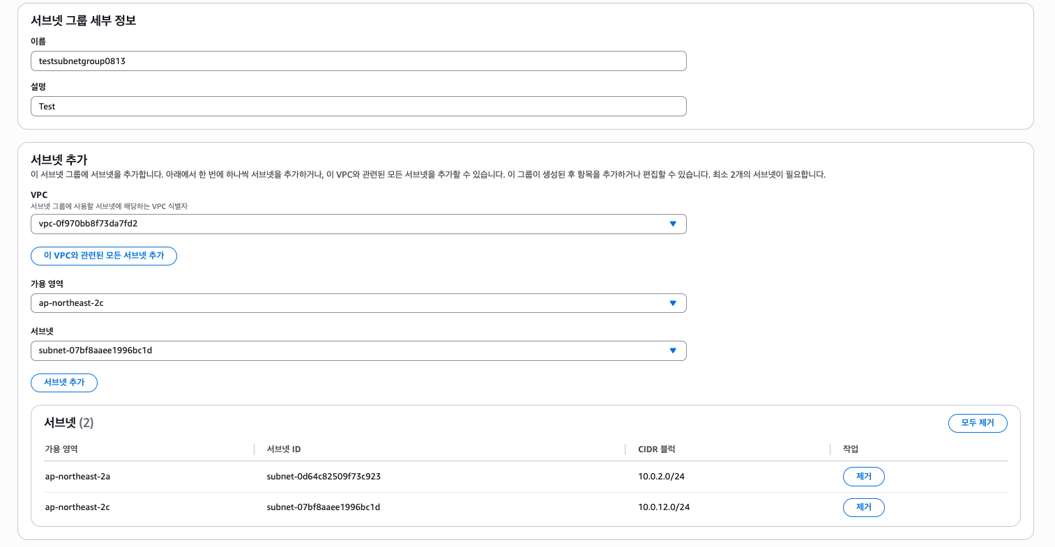 네트워크 설정에서 서브넷 그룹은 아까 만들어뒀던걸 선택하였다.