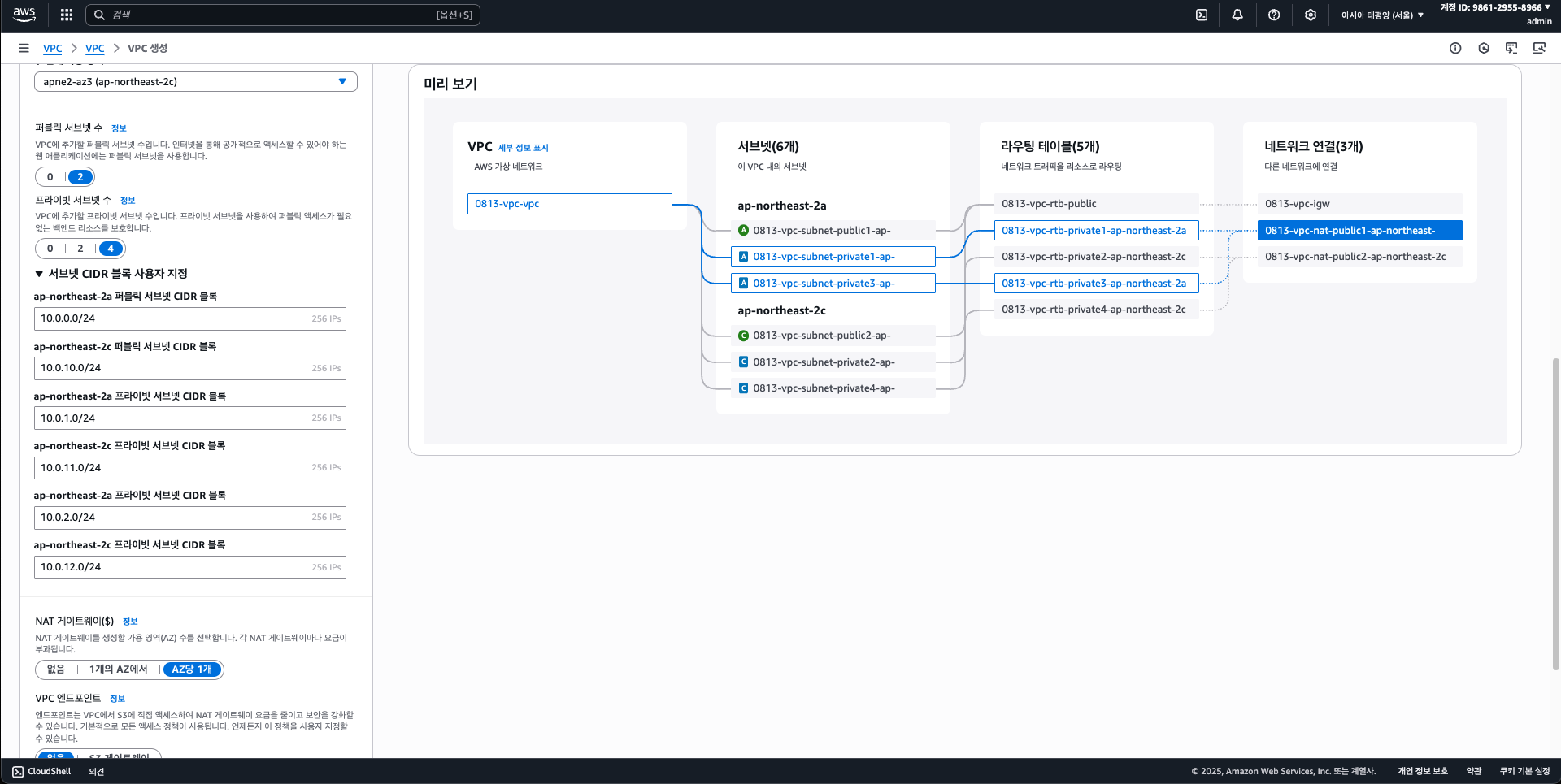 10.0.0.0/1610.0.0.0/24 (ap-northeast-2a)10.0.1.0/24 (ap-northeast-2a)10.0.2.0/24 (ap-northeast-2a)10.0.10.0/24 (ap-northeast-2c)10.0.11.0/24 (ap-northeast-2c)10.0.12.0/24 (ap-northeast-2c)NAT Gateway는 Public Subnet A, Public Subnet B에 2개를 배치한다. (하나만 써도 되지만 고가용성을 위해선 각 AZ에 두는것이 좋다)