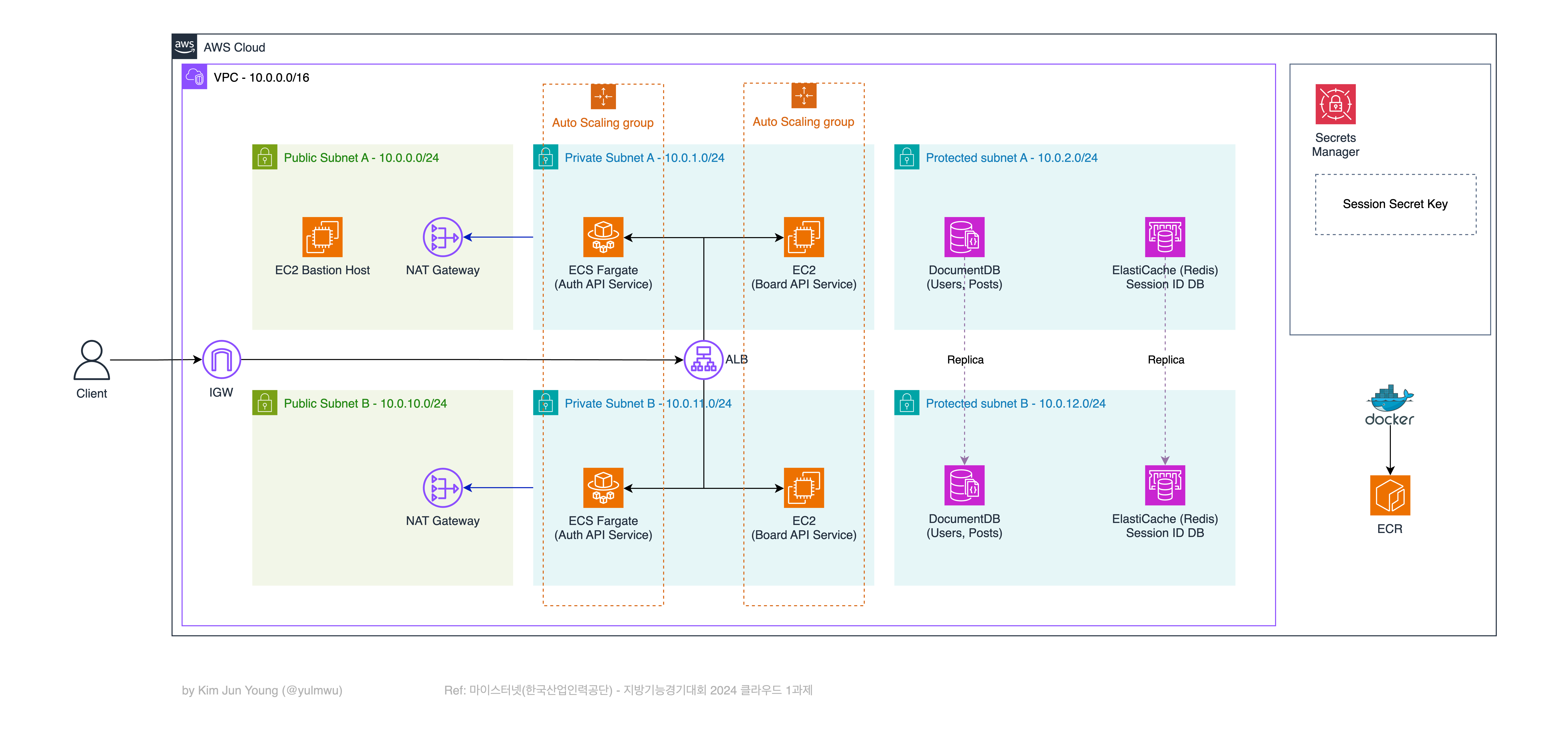 편의를 위해 과제에 나온 아키텍처는 유지하면서 서브넷에 CIDR 정보를 추가하였고, 여러가지 부가적인 내용도 추가하였다. 또한 기존엔 EKS를 사용하는 아키텍처였으나, ECS로 대체하였다.
