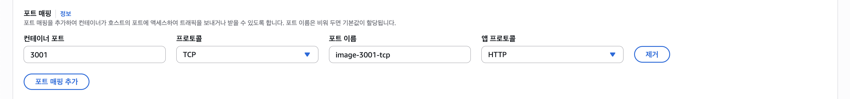 포트는 내부적으로 3001으로 설정해뒀으니 80번 HTTP와 컨테이너의 3001 포트를 매핑시켜줬다.