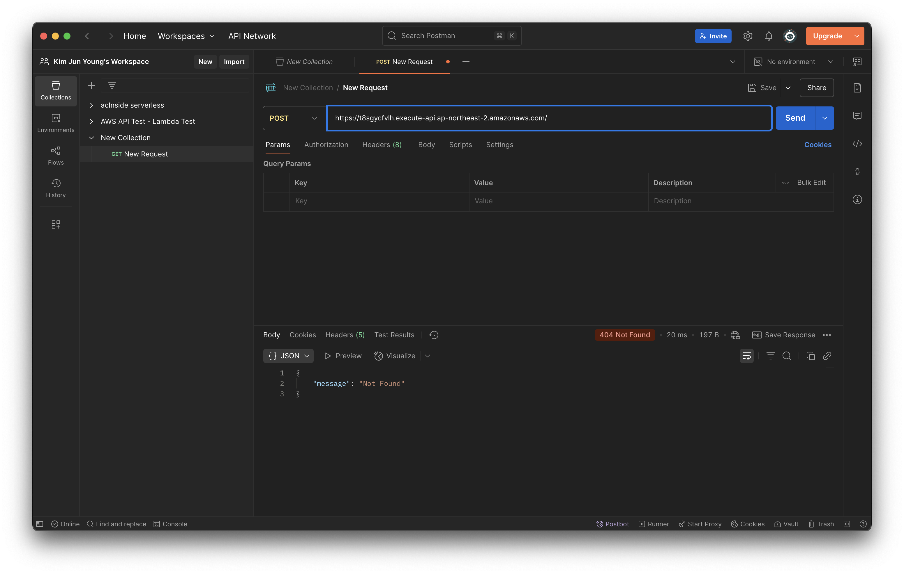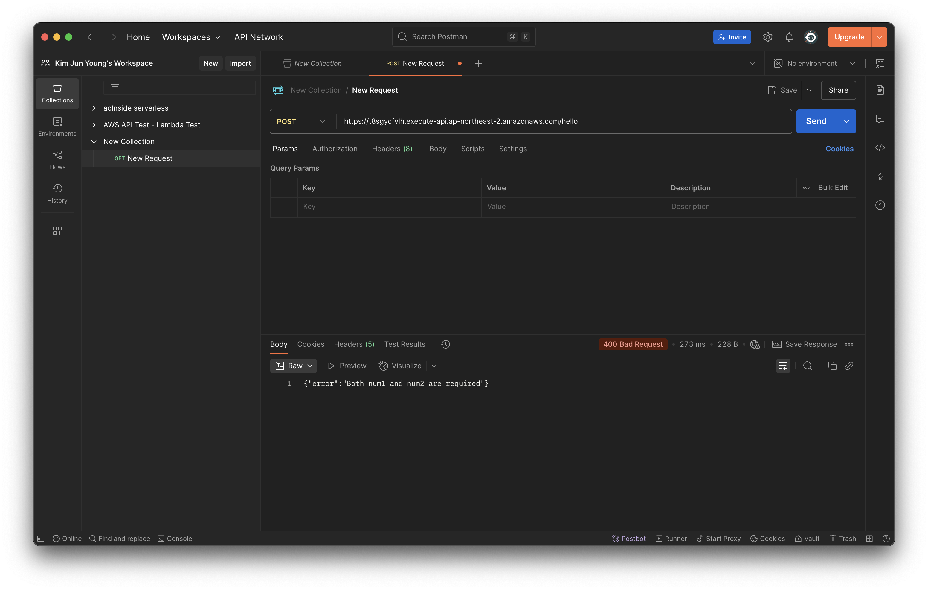 Postman을 실행하여 새로운 컬렉션을 만들고, 우클릭 후 New Request로 요청을 생성한다.