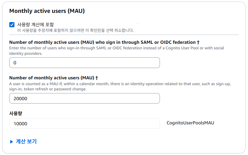 Number of monthly active users (MAU) who sign in through SAML or OIDC federation는 OAuth, OIDC와 관련된 내용인데 이건 사용하지 않으므로 0으로 설정한다.