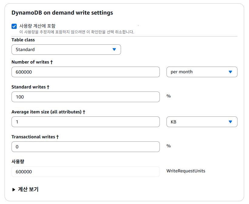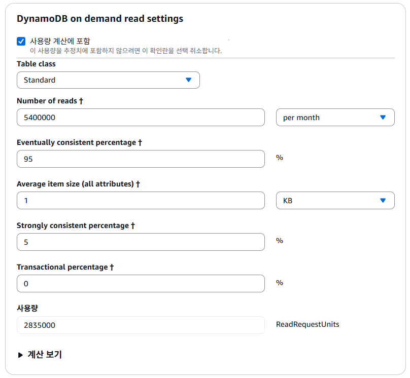 마지막으로 스토리지 용량의 경우 DynamoDB의 총 용량을 의미하는데, 게시글이 10만개, 댓글이 50만개라고 가정하면 (100,000 + 500,000) x 1KB = 약 600MB, 여유잡아 1GB라고 설정하였다.