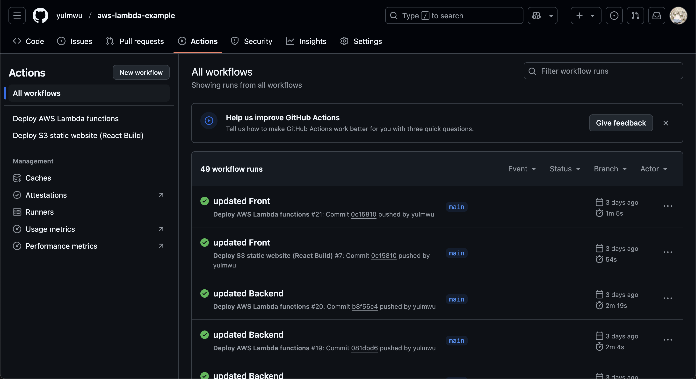 이로써 프론트엔드에 대한 Github Actions 워크플로우 작성도 마쳤다.